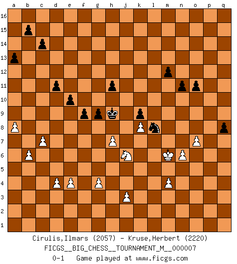 Last move : 0-1 2024 July 14 15:43:40 [Event "FICGS__BIG_CHESS__TOURNAMENT_M__000007"] [Site "FICGS"] [Date "2024.06.21"] [Round "1"] [White "Cirulis,Ilmars"] [Black "Kruse,Herbert"] [Result "0-1"] [WhiteElo "2057"] [BlackElo "2220"] 1.j2-k4 h15-g13 2.d2-d4 j15-k13 3.h2-g4 h16-o10 4.n2-n3 e15-e13 5.c1-h6 m15-m13 6.h1-p8 p16-o14 7.p1-o3 l16-p12 8.o1-j6 q15-q13 9.b1-d2 b16-c14 10.d2-e4 n15-n14 11.e2-e3 k16-h15 12.f1-b5 g16-j15 13.a2-a4 a15-a13 14.m2-m3 f16-b12 15.b5-f9 d15-d14 16.f9-h7 c16-h11 17.l1-m2 b12-h6 18.g4-h6 o16-l13 19.g1-j2 o10-p9 20.p8-p9 l13-p9 21.a1-a3 p12-j6 22.k4-j6 p9-l13 23.a3-b3 c14-b12 24.a4-a5 h11-a4 25.b3-b9 a4-d7 26.b9-c9 e16-e15 27.m2-j5 d7-g10 28.k1-h2 g10-c14 29.h2-f3 e15-e14 30.j1-h2 e14-f14 31.e1-a1 f14-f10 32.a1-a4 f10-p10 33.q1-p1 o14-p12 34.a4-c4 g13-e14 35.c4-c8 h15-g13 36.c8-l8 l13-k14 37.b2-b4 m16-m14 38.m3-m4 m14-l14 39.l8-l14 j15-l14 40.c9-o9 o15-o14 41.c2-c4 j16-j15 42.h7-j8 c14-j8 43.h6-j8 p12-n11 44.o9-o10 p10-o10 45.j5-o10 a16-a14 46.m1-m3 a14-c14 47.e4-d6 m13-m12 48.o10-k6 k14-c7 49.c4-c5 c14-c10 50.m3-l3 q16-q14 51.l3-l8 q14-p14 52.k6-g3 c10-p10 53.o3-n1 p10-q10 54.d6-f7 c7-g3 55.f2-g3 q10-q2 56.j8-g7 q2-q7 57.f7-h8 n14-n13 58.l8-l7 q7-l7 59.j6-l7 p14-p7 60.l7-j6 p7-q7 61.n1-m3 l14-k12 62.p1-f1 e14-f12 63.b4-b5 k13-l11 64.a5-a6 k12-j10 65.g7-f9 j10-h8 66.f9-h8 g13-h11 67.f3-e5 f15-f14 68.f1-f7 q7-f7 69.e5-f7 l15-l13 70.m3-l5 k15-k13 71.k2-k4 j14-j13 72.l2-l4 j15-j14 73.h3-h4 q13-q12 74.h2-h3 p15-p13 75.g3-g4 o14-o13 76.j2-l3 p13-p12 77.l3-m5 q12-q11 78.h3-j4 q11-q10 79.j4-k5 p12-p11 80.k5-l6 o13-o12 81.l5-k7 q10-q9 82.m5-l7 p11-p10 83.l6-m7 o12-o11 84.p2-p4 n13-n12 85.j6-k8 h11-k10 86.f7-g9 e13-e12 87.m7-m8 d14-d13 88.m8-l9 k10-m11 89.l9-l8 h14-h13 90.l7-j8 j13-j12 91.o2-o4 c15-c14 92.a6-a7 b12-d11 93.g9-j10 l11-j10 94.k8-j10 j14-j13 95.j10-k8 f12-h11 96.l8-k9 n11-l12 97.k8-h9 h13-h12 98.k7-j9 l12-m10 99.k9-k8 h11-j9 100.k8-j9 m10-k11 101.j9-k9 g15-g13 102.b5-b6 f14-f13 103.o4-o5 g13-g12 104.p4-p5 f13-f12 105.o5-o6 f12-f11 106.n3-n4 g12-g11 107.g4-g5 g11-g10 108.h9-j7 h12-h11 109.g2-g4 k13-k12 110.j7-g8 j13-h12 111.p5-p6 l13-l12 112.c5-c6 j12-j11 113.p6-p7 n12-n11 114.n4-n5 f11-f10 115.a7-a8 f10-f9 116.g8-j7 d11-f10 117.c6-c7 k11-h10 118.j8-h10 j11-h10 119.k4-k5 k12-k11 120.g5-g6 l12-l11 121.l4-l5 l11-l10 122.k9-k8 h12-j11 123.k5-k6 e12-e11 124.e3-e4 e11-e10 125.o6-o7 d13-d12 126.l5-l6 d12-d11 127.l6-l7 g10-g9 128.h8-j6 j11-j10 129.h4-h5 k11-k10 130.k8-k7 l10-l9 131.h5-h6 h10-h9 132.h6-h7 h9-h8 133.j7-h5 f10-h9 134.g6-g7 h8-g7 135.h5-g7 h9-g7 136.j6-g7 p10-p9 137.k7-l6 j10-j9 138.g7-j6 k10-k9 139.k6-k7 m11-n9 140.n5-n6 q9-q8 141.k7-k8 l9-k8 142.l7-k8 j9-h9 143.p7-q8 p9-q8 144.l6-m6 n9-l8 0-1 Comment by player 2 : Herbert Kruse : thank u 4 playing so fair, really love ur way :) Follow this game move after move (download)Play the opening like a book, the middle game like a magician, and the endgame like a machine. (Spielmann) Karpov ist ein Museumsstück. (Garry Kasparov) ¿Cual es el objetivo de jugar una apertura de gambito?... Para adquirir una reputación de ser un jugador apuesto a costo de perder el juego. (Siegbert Tarrasch) Les ravages du H expliquent la différence de niveau entre Tal et Thal [Abergel]. You know what they say : You lie down with the Devil, you wake up in Hell. (Horatio Caine, C.S.I. Miami)