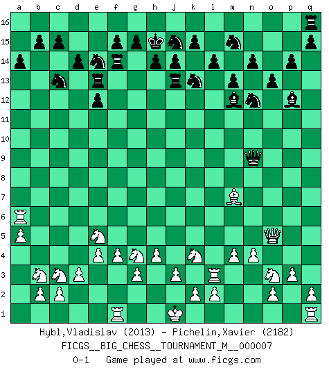 Last move : 0-1 2024 October 30 12:36:29 [Event "FICGS__BIG_CHESS__TOURNAMENT_M__000007"] [Site "FICGS"] [Date "2024.06.21"] [Round "1"] [White "Hybl,Vladislav"] [Black "Pichelin,Xavier"] [Result "0-1"] [WhiteElo "2013"] [BlackElo "2182"] 1.j2-k4 p16-o14 2.m2-m4 j15-k13 3.h2-g4 h16-o10 4.p1-o3 e15-e13 5.b1-c3 f16-b12 6.d2-d3 m15-m13 7.e2-e4 l16-p12 8.k1-h2 n15-n14 9.n2-n4 d15-d14 10.g2-g3 h15-g13 11.c1-h6 o16-f8 12.h6-f8 b12-f8 13.h1-p8 f8-l13 14.o1-d11 e13-e12 15.d11-f9 g16-j15 16.f1-e2 p15-p14 17.l1-q6 k16-m15 18.p8-o8 c16-l8 19.g4-e5 l8-e2 20.g1-e2 b16-d15 21.o8-c8 d15-c13 22.e2-d4 o10-p10 23.p2-p3 p10-b10 24.d4-b3 b10-f6 25.c8-f5 f6-q6 26.m1-m3 e16-e14 27.h2-g4 q6-n9 28.f9-g10 a16-e16 29.m3-l3 e14-f14 30.f5-o5 l13-m12 31.e1-f1 e16-e13 32.a2-a4 e13-f13 33.h3-h4 o14-n12 34.a4-a5 j16-h15 35.a1-a4 o15-o13 36.a4-c4 l15-l14 37.f2-f4 m16-e16 38.c4-c6 e16-e13 39.c6-a6 a15-a14 40.g10-l6 g13-e14 41.l6-m7 f13-j13 0-1 Follow this game move after move (download)Examine moves that smite! A good eye for smites is far more important than a knowledge of strategical principles. (Purdy) Ich organisiere ein großes Turnier, was mich etwa 120000 Dollar kostet. Ich denke, das ist das erste Mal in der Schachgeschichte, daß ein Schachgroßmeister auch als Mäzen auftritt. (Miguel Najdorf) El Ajedrez te enseña a controlarl la excitación inicial que sientes cuando vez algo que parece bueno y te enseña a pensar objetivamente cuando te encuentras en problemas. (Stanley Kubrick) Les échecs, c'est l'imagination. (David Bronstein) Work expands to fill the time available. (C. Northcote Parkinson, in Parkinson's Laws)