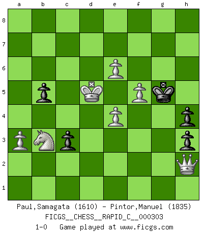 Last move : 1-0 2024 July 15 16:0:9 [Event "FICGS__CHESS__RAPID_C__000303"] [Site "FICGS"] [Date "2024.06.24"] [Round "1"] [White "Paul,Samagata"] [Black "Pintor,Manuel"] [Result "1-0"] [WhiteElo "1610"] [BlackElo "1835"] 1.e4 e5 2.Nf3 Nc6 3.Bc4 Bc5 4.a3 a6 5.Nc3 d6 6.d3 Bg4 7.O-O Nd4 8.Bxf7+ Kf8 9.Ba2 c6 10.Be3 Nxf3+ 11.gxf3 Bh3 12.Re1 Qf6 13.Kh1 Bxe3 14.fxe3 Qg5 15.Qe2 Nf6 16.Rg1 Qh6 17.Rg3 Ke7 18.Rag1 g6 19.Rg5 Be6 20.Bxe6 Kxe6 21.d4 b5 22.f4 Kd7 23.dxe5 dxe5 24.Rxe5 Rhe8 25.Qd3+ Kc7 26.Rd1 Rad8 27.Qe2 Nh5 28.Qg4 Nf6 29.Qg1 Rxd1 30.Qxd1 Qh3 31.Rxe8 Nxe8 32.Qe2 Nf6 33.e5 Ng4 34.e4 h5 35.f5 g5 36.e6 Kd6 37.Qd3+ Qxd3 38.cxd3 Nf2+ 39.Kg2 Nxd3 40.b4 Ne5 41.Nb1 Nc4 42.h3 Ke7 43.Kf2 Kf6 44.Kf3 Nd6 45.Nd2 Ke5 46.Ke3 Kf6 47.Kd4 Nb7 48.Nb3 h4 49.Nd2 a5 50.bxa5 c5+ 51.Kd5 c4 52.a6 c3 53.Nb3 g4 54.axb7 gxh3 55.b8Q Kg5 56.Qh2 1-0 Follow this game move after move (download)Robert Fischer is a law unto himself. (Larry Evans) Ich suche im Schach immer etwas Eigenes. Riskantes Spiel im Stile schachlicher Musketiere ist nicht meine Sache, auch wenn es vielen Freunden scharfer Wendungen gefällt. (Anatoly Karpov) Coloca el contenido de las piezas del Ajedrez en un sombrero, agitalo vigorosamente, arrojalas en un tablero desde una altura de 30 centimetros y así obtendras el estilo de Steinitz. (H. E. Bird) Karpov est une pièce de musée. (Garry Kasparov) For a mechanic, you seem to do an excessive amount of thinking. (C-3PO in Star Wars ep.2)