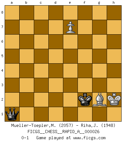 Last move : 0-1 2007 October 8 15:32:32 [Event "FICGS__CHESS__RAPID_A__000026"] [Site "FICGS"] [Date "2007.09.19"] [Round "1"] [White "Mueller-Toepler,Michael"] [Black "Riha,Josef"] [Result "0-1"] [WhiteElo "2057"] [BlackElo "1948"] 1.c4 Nf6 2.d4 e6 3.Nf3 b6 4.Nc3 Bb7 5.a3 d5 6.cxd5 Nxd5 7.e3 Be7 8.Bb5+ c6 9.Bd3 Nxc3 10.bxc3 c5 11.O-O O-O 12.Qc2 h6 13.e4 Qc7 14.Qe2 Nc6 15.Be3 Rfd8 16.Rfc1 Na5 17.Bc2 Rac8 18.h3 Qb8 19.e5 cxd4 20.Qd3 g6 21.cxd4 Nc4 22.Bb3 Nxe3 23.fxe3 Rxc1+ 24.Rxc1 Kg7 25.Bc4 Qa8 26.Rf1 Be4 27.Qe2 Bxa3 28.Nh2 Rc8 29.Qf2 Bf5 30.Be2 Rc1 31.Bf3 Rxf1+ 32.Qxf1 Qc8 33.Qa1 Qc1+ 34.Qxc1 Bxc1 35.e4 Be3+ 36.Kf1 Bxh3 37.gxh3 Bxd4 38.Be2 Bxe5 39.Nf3 Kf6 40.Kf2 a5 41.Bb5 g5 42.Nd2 Ke7 43.Nc4 Bd4+ 44.Kf3 f5 45.e5 Bc5 46.Kg3 h5 47.Kf3 Bd4 48.Bc6 Kd8 49.Ba4 Kc7 50.Bb5 Bc3 51.Ke3 Bb4 52.Nd2 Bc5+ 53.Kd3 g4 54.hxg4 fxg4 55.Ne4 h4 56.Nxc5 bxc5 57.Ke3 h3 58.Kf2 h2 59.Kg2 g3 60.Bf1 Kd7 61.Be2 Ke7 62.Bc4 a4 63.Kh1 a3 64.Kg2 Kf7 65.Ba2 Kg6 66.Bxe6 Kg5 67.Bd5 Kf4 68.e6 c4 69.Bxc4 Ke3 70.e7 h1Q+ 71.Kxh1 Kf2 72.Bf1 g2+ 73.Bxg2 a2 74.Kh2 a1Q 0-1 English, 1...Nf6 (Anglo-Indian defense) Kingside Castling by player White (move 11) Kingside Castling by player Black (move 11) 10 pieces endgame at move 56 : White KBNP , Black KPPPPP WHITE : King + 1 Bishop 1 Knight 1 Pawn BLACK : King + 5 Pawns 9 pieces endgame at move 56 : White KBP , Black KPPPPP WHITE : King + 1 Bishop 1 Pawn BLACK : King + 5 Pawns 8 pieces endgame at move 66 : White KBP , Black KPPPP WHITE : King + 1 Bishop 1 Pawn BLACK : King + 4 Pawns 7 pieces endgame at move 69 : White KBP , Black KPPP WHITE : King + 1 Bishop 1 Pawn BLACK : King + 3 Pawns Promotion Queen by player Black (move 70) 6 pieces endgame at move 71 : White KBP , Black KPP WHITE : King + 1 Bishop 1 Pawn BLACK : King + 2 Pawns 5 pieces endgame at move 73 : White KBP , Black KP WHITE : King + 1 Bishop 1 Pawn BLACK : King + 1 Pawn Promotion Queen by player Black (move 74) Player Black won this chess game. Follow this game move after move (download)There are two classes of men; those who are content to yield to circumstances and who play whist; those who aim to control circumstances, and who play Chess. (Mortimer Collins) Fischer machte Schach einfach zu einer aufregenden Sache, wann immer er sich ans Brett setzte. (Raymond Keene) Uno no tiene que jugar muy bien, es suficiente jugar mejor que el oponente. (Siegbert Tarrasch) Ce n'est pas pour s'amuser qu'il joue aux échecs : il célèbre un culte. (Vladimir Nabokov) I don't believe in psychology. I believe in good moves. (Bobby Fischer)