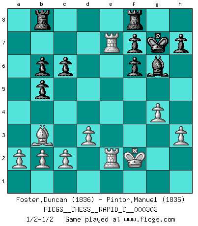 Last move : 1/2-1/2 2024 July 31 20:20:5 [Event "FICGS__CHESS__RAPID_C__000303"] [Site "FICGS"] [Date "2024.06.24"] [Round "1"] [White "Foster,Duncan"] [Black "Pintor,Manuel"] [Result "1/2-1/2"] [WhiteElo "1836"] [BlackElo "1835"] 1.e4 e5 2.Nf3 Nc6 3.Nc3 Bc5 4.Bc4 d6 5.O-O Bg4 6.h3 Bh5 7.d3 Nd4 8.g4 Nxf3+ 9.Qxf3 Bg6 10.Na4 Bb6 11.Nxb6 axb6 12.Qg3 Nf6 13.f4 exf4 14.Bxf4 O-O 15.Rae1 Kh8 16.e5 dxe5 17.Bxe5 c6 18.Bxf6 gxf6 19.Qf2 b5 20.Bb3 Kg7 21.Re3 Qd4 22.Re7 Qxf2+ 23.Rxf2 b6 24.Rfe2 Rab8 25.Kf2 1/2-1/2 Follow this game move after move (download)The passion for playing Chess is one of the most unaccountable in the world. (H.G. Wells) Frage: Was machen Sie mit den Preisen? Anwort: Ich habe Angst, dass meine Freundin davon neue Kleider kauft. (Loek van Wely) Debió haber existido una vez en que los hombres eran semidióses, de otra manera no hubiesen podido inventar el Ajedrez. (Gustav Schenk) Les erreurs sont comme les malheurs, elles n'arrivent jamais seules. (Siegbert Tarrasch) But they are useless. They can only give you answers. (Pablo Picasso, about computers)