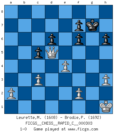 Last move : 1-0 2024 September 6 0:32:45 [Event "FICGS__CHESS__RAPID_C__000303"] [Site "FICGS"] [Date "2024.06.24"] [Round "1"] [White "Leurette,Marc-Antoine"] [Black "Brodie,Peter"] [Result "1-0"] [WhiteElo "1608"] [BlackElo "1692"] 1.e4 e5 2.Nf3 d6 3.Nc3 Bg4 4.Bc4 Nf6 5.d3 Be7 6.O-O O-O 7.h3 Bh5 8.Be3 h6 9.d4 exd4 10.Bxd4 c5 11.Bxf6 Bxf6 12.Nd5 Bxb2 13.Rb1 Bd4 14.c3 Bf6 15.Rxb7 Nc6 16.Qa4 Na5 17.Rd7 Qc8 18.Bb5 Nb7 19.Ba6 Bxf3 20.Nxf6+ gxf6 21.Bxb7 Qe8 22.Bxa8 Bxg2 23.Kxg2 Qxa8 24.Rxa7 Qb8 25.Kh1 Kh8 26.Rg1 Rg8 27.Rxg8+ Qxg8 28.Ra8 Qxa8 29.Qxa8+ Kg7 30.Qd5 1-0 Follow this game move after move (download)Best by test: 1. e4 (Bobby Fischer) Oft bringt ein stiller Zug das Erdbeben. (Richard Reti) Vive, pierde y aprende al observar a tu oponente como gana. (Amber Steenbock) Il a essayé de se convaincre qu'il pourrait empêcher toutes les erreurs et ne jamais perdre. L'horreur ! Gary Kasparov au sujet de Robert Fischer. Wisdom is the reward you get for a lifetime of listening when you'd have preferred to talk. (Doug Larson)