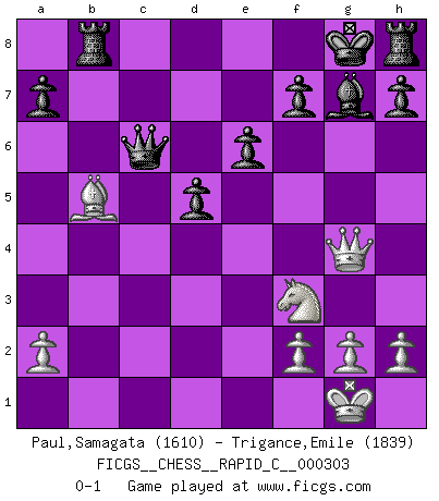 Last move : 0-1 2024 August 17 11:58:49 [Event "FICGS__CHESS__RAPID_C__000303"] [Site "FICGS"] [Date "2024.06.24"] [Round "1"] [White "Paul,Samagata"] [Black "Trigance,Emile"] [Result "0-1"] [WhiteElo "1610"] [BlackElo "1839"] 1.e4 e6 2.d4 d5 3.e5 c5 4.c3 Nc6 5.Nf3 Qb6 6.Be2 cxd4 7.cxd4 Nh6 8.Bxh6 Qxb2 9.Bxg7 Bxg7 10.Nbd2 Nxd4 11.Nxd4 Qxd4 12.Nf3 Qc3+ 13.Nd2 Bxe5 14.O-O Qc7 15.Rc1 Qe7 16.Nf3 Bg7 17.Qa4+ Kf8 18.Rc2 Bd7 19.Qb3 Bc6 20.Rfc1 Rc8 21.Bb5 Qd6 22.Qa4 Bh6 23.Rxc6 bxc6 24.Rc2 Rb8 25.Rxc6 Qxc6 26.Qb4+ Kg8 27.Qg4+ Bg7 0-1 Follow this game move after move (download)The blunders are all there on the board, waiting to be made. (Savielly Tartakover) Schach ist die gewalttätigste aller Sportarten. (Garry Kasparov) El Ajedrez moderno está demasiado preocupado con cosas como la estructura de Peones. Olvidenlo, el Jaque Mate termina la partida. (Nigel Short) Seul un grand joueur sait à quel point il joue faiblement. (Xavier Tartacover) It is not titles that honor men, but men that honor titles. (Niccolo Machiavelli)