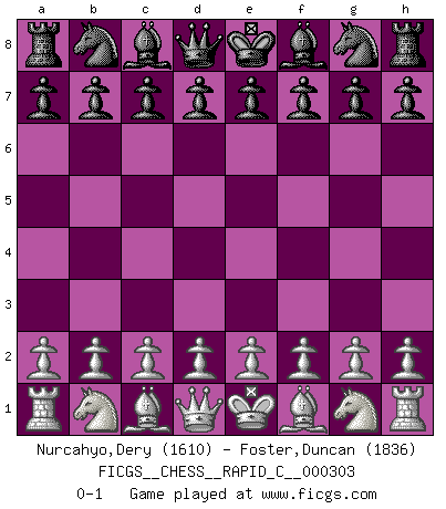 Last move : 0-1 2024 July 25 0:3:37 [Event "FICGS__CHESS__RAPID_C__000303"] [Site "FICGS"] [Date "2024.06.24"] [Round "1"] [White "Nurcahyo,Dery"] [Black "Foster,Duncan"] [Result "0-1"] [WhiteElo "1610"] [BlackElo "1836"] 0-1 This chess game has been lost on time (started : 2024.06.24 15:12:51) Follow this game move after move (download)The isolated Pawn casts gloom over the entire chessboard. (Aaron Nimzovich) Ich kämpfe solange mein Gegner einen Fehler machen kann. (Emanuel Lasker) Solo existe una cosa que Fischer hace en el Ajedrez sin placer: ¡perder!. (Boris Spassky) Si le désir cupide (et stupide) de gagner est une inépuisable source de souffrance, une combinaison brillante sur l'échiquier est une découverte : le coquelicot qui s'épanouit lorsque apparaît la Voie Lactée. (Arrabal) Gambling is the son of avarice and the father of despair. (French proverb)