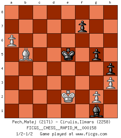 Last move : 1/2-1/2 2024 November 22 8:22:5 [Event "FICGS__CHESS__RAPID_M__000158"] [Site "FICGS"] [Date "2024.06.28"] [Round "1"] [White "Pech,Matej"] [Black "Cirulis,Ilmars"] [Result "1/2-1/2"] [WhiteElo "2171"] [BlackElo "2258"] 1.e4 e5 2.Nf3 Nc6 3.Bb5 a6 4.Ba4 b5 5.Bb3 Nf6 6.O-O Bc5 7.c3 d6 8.d4 Bb6 9.a4 Bb7 10.Re1 O-O 11.Bg5 h6 12.Bh4 exd4 13.cxd4 g5 14.Bg3 Re8 15.d5 Na5 16.Bc2 c6 17.dxc6 Bxc6 18.Nc3 b4 19.Nd5 Bxd5 20.exd5 Rc8 21.Qd2 Nc4 22.Rxe8+ Qxe8 23.Qxb4 Qe2 24.Bf5 Rb8 25.Nd4 Qxb2 26.Qxb2 Nxb2 27.Bxd6 Rd8 28.Be5 Rxd5 29.Nc6 Kg7 30.a5 Bc5 31.Bc8 Nd3 32.Bxf6+ Kxf6 33.Bxa6 Nxf2 34.Kf1 Ne4 35.Re1 Nc3 36.Rc1 Rf5+ 37.Ke1 Bf2+ 38.Kd2 Nd5 39.Rf1 Be3+ 40.Ke2 Rxf1 41.Kxf1 Ne7 42.Nxe7 Kxe7 43.Bd3 Kd6 44.Ke2 Bg1 45.h3 h5 46.a6 Ke5 47.Bb5 h4 1/2-1/2 Follow this game move after move (download)Chess is like war on a board. (Bobby Fischer) Spielt Blackmar-Diemer-Gambit, und das Matt kommt von selbst! (Emil Joseph Diemer) Cualquier cambio de material en una posición debe venir por medio de un mate, una captura o promoción de Peón. (Purdy) Les écrivains ont utilisé les échecs pour analyser les côtés extrêmes de la nature humaine. Dans ce cadre, les échecs offrent un champ d'expérimentation idéal. Mais on pourrait faire la même chose avec la peinture. Et là, en vous référant à Van Gogh, vous ne tirerez pas de conclusion définitive sur les peintres. (Gary Kasparov) Live, lose, and learn, by observing your opponent how to win. (Amber Steenbock)