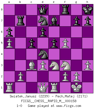 Last move : 1-0 2024 September 17 4:20:34 [Event "FICGS__CHESS__RAPID_M__000158"] [Site "FICGS"] [Date "2024.06.28"] [Round "1"] [White "Swiatek,Janusz"] [Black "Pech,Matej"] [Result "1-0"] [WhiteElo "2239"] [BlackElo "2171"] 1.e4 e5 2.Nf3 Nc6 3.Bb5 a6 4.Ba4 Nf6 5.O-O Be7 6.Re1 b5 7.Bb3 O-O 8.a4 Bb7 9.d3 d6 10.Bd2 b4 11.c3 Rb8 12.h3 bxc3 13.Bxc3 Na7 14.Na3 c5 15.Nc4 Nc6 16.a5 Nd7 17.Ba2 Kh8 18.Ne3 Nd4 19.Bd5 f5 20.Bxb7 Rxb7 21.exf5 1-0 Follow this game move after move (download)It is peculiar but a fact nevertheless, that gamblers in chess always have enthusiastic followers. (Botvinnik) Der Schachmeister von Heute braucht Courage, einen Killerinstinkt, Ausdauer und Arroganz. (Larry Evans) Las ideas audaces son como las piezas del Ajedrez que avanzan hacia adelante. Ellas pueden ser vencidas, pero también pueden iniciar una partida victoriosa. (Goethe) Il a essayé de se convaincre qu'il pourrait empêcher toutes les erreurs et ne jamais perdre. L'horreur ! Gary Kasparov au sujet de Robert Fischer. You think that education is too expensive ? Try ignorance. (Derek Bok)