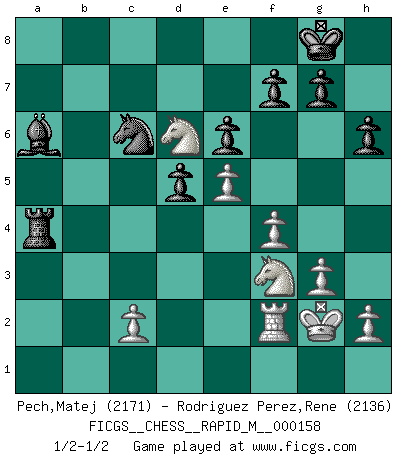 Last move : 1/2-1/2 2024 October 12 20:7:40 [Event "FICGS__CHESS__RAPID_M__000158"] [Site "FICGS"] [Date "2024.06.28"] [Round "1"] [White "Pech,Matej"] [Black "Rodriguez Perez,Rene"] [Result "1/2-1/2"] [WhiteElo "2171"] [BlackElo "2136"] 1.d4 e6 2.e4 d5 3.Nc3 Nf6 4.e5 Nfd7 5.f4 c5 6.Nf3 Nc6 7.Be3 a6 8.Qd2 b5 9.dxc5 Bxc5 10.Bd3 Qb6 11.Bf2 h6 12.a3 Bb7 13.O-O Bxf2+ 14.Rxf2 Nc5 15.b4 Nxd3 16.Qxd3 O-O 17.Ne2 a5 18.Rb1 axb4 19.axb4 Nxb4 20.Qd4 Qxd4 21.Nexd4 Ra4 22.Nxb5 Nc6 23.Nd6 Ba6 24.g3 Rb8 25.Rxb8+ Nxb8 26.Kg2 Nc6 1/2-1/2 Follow this game move after move (download)Pawns: they are the soul of this game, they alone form the attack and defense. (Philidor) Glücklicherweise sind Großmeister Ruben Fines reine Schachbücher weniger phallozentrisch [als seine Schachpsychologie] und deswegen auch weniger lächerlich. (Nigel Short) Una mala movida nulifica cuarenta buenas. (Horowitz) Le profane ne songe pas à la somme de jouissance dont il se prive, qui méconnaît ce jeu aux ressources aussi variées que passionnantes. (Jean-Marie Jeanton-Lamarche) No man has ever achieved immortality in his own life time. (Unknown)