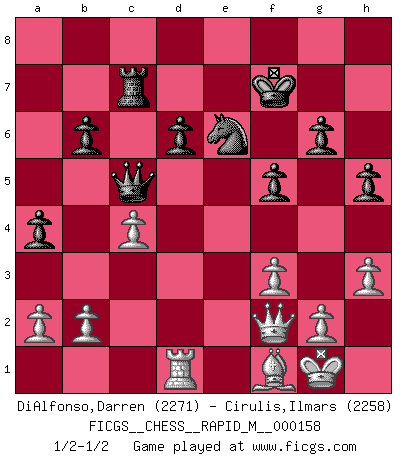 Last move : 1/2-1/2 2024 July 15 4:55:14 [Event "FICGS__CHESS__RAPID_M__000158"] [Site "FICGS"] [Date "2024.06.28"] [Round "1"] [White "DiAlfonso,Darren"] [Black "Cirulis,Ilmars"] [Result "1/2-1/2"] [WhiteElo "2271"] [BlackElo "2258"] 1.e4 c5 2.Nf3 g6 3.d4 cxd4 4.Nxd4 Nc6 5.c4 Nf6 6.Nc3 d6 7.Be2 Nxd4 8.Qxd4 Bg7 9.Be3 O-O 10.Qd2 a5 11.O-O a4 12.Bd4 Qa5 13.Rad1 Bd7 14.Qe3 Bc6 15.Nd5 Bxd5 16.exd5 Rfe8 17.Qa3 Nd7 18.Be3 Rec8 19.Rb1 b6 20.Rfd1 Rc7 21.Bd2 Qa6 22.Qe3 Nc5 23.Bc3 Bxc3 24.Qxc3 Qc8 25.Bf1 f5 26.Re1 Qf8 27.Qd4 Qf6 28.Qd1 Kg7 29.Qd2 h5 30.Re3 Ne4 31.Qd1 Nc5 32.h3 Re8 33.Qd2 Kf7 34.Rbe1 Ne4 35.Qc2 e6 36.dxe6+ Rxe6 37.f3 Nc5 38.Rxe6 Nxe6 39.Rd1 Qe5 40.Qf2 Qc5 1/2-1/2 Follow this game move after move (download)Chess is not like life... it has rules ! (Mark Pasternak) Ohne ihre Erfolge schmälern zu wollen würde ich sagen Petrosian, Spassky und Karpov verdanken ihre Siege ihren Trainern - Boleslavsky, Bondarevsky und Furman. (Mikhail Moiseyevich Botvinik) Del Ajedrez se ha dicho que la vida no es lo suficientemente larga para él, pero eso es culpa de la vida, no del Ajedrez. (William Ewart Napier) Le système Elo représente seulement une moyenne. Il est simplement un indicateur de votre stabilité. (Anatoli Karpov) Perhaps the current trend of many chess professionals taking up the more lucrative pastime of poker is not a wholly negative one. It may not be too late for humans to relearn how to take risks in order to innovate and thereby maintain the advanced lifestyles we enjoy. And if it takes a poker-playing supercomputer to remind us that we can't enjoy the rewards without taking the risks, so be it. (The Chess Master and the Computer, by Garry Kasparov - 2010)