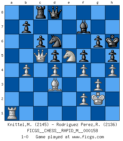 Last move : 1-0 2024 December 6 17:26:23 [Event "FICGS__CHESS__RAPID_M__000158"] [Site "FICGS"] [Date "2024.06.28"] [Round "1"] [White "Knittel,Martin"] [Black "Rodriguez Perez,Rene"] [Result "1-0"] [WhiteElo "2145"] [BlackElo "2136"] 1.c4 e6 2.Nc3 f5 3.g3 Nf6 4.Bg2 d5 5.cxd5 exd5 6.Nf3 c6 7.O-O a5 8.d3 Be7 9.Qc2 Na6 10.a3 O-O 11.e3 Nc5 12.b3 Bd6 13.Bb2 Ne6 14.Rfe1 Ng4 15.Ne2 Qc7 16.Bc3 Qe7 17.h3 Nf6 18.Qd2 Bxa3 19.Bxa5 Rxa5 20.Qxa5 Bb4 21.Qa4 Bxe1 22.Rxe1 Ne8 23.h4 Nd6 24.d4 Bd7 25.Nf4 Rc8 26.Ne5 Nxf4 27.exf4 Be8 28.Qa3 Qc7 29.Bf1 h5 30.Ra1 g6 31.Bd3 Qd8 32.Kg2 Kg7 33.Nf3 Qc7 34.b4 Bf7 35.Ne5 Nc4 36.Qc3 Nd6 37.Nf3 Qd8 38.Qc5 Kh6 39.Ne5 1-0 This chess game has been lost on time (started : 2024.06.28 18:13:17) Follow this game move after move (download)My style is somewhere between that of Tal and Petrosian. (Reshevsky) Schach ist die gewalttätigste aller Sportarten. (Garry Kasparov) La vida es como el Ajedrez, con lucha, competición y eventos buenos y malos. (Benjamin Franklin) Shah mat. Le roi est mort. Cri de fierté d'un joueur venant de terrasser son adversaire, courtoisement, sans effusion de sang. There will be no order, only chaos. (Sol Robeson in Pi by Darren Aronofsky)