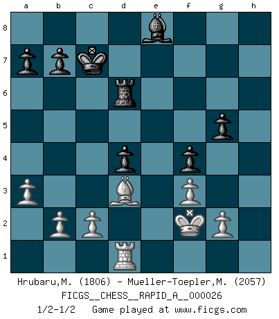 Last move : 1/2-1/2 2007 November 5 16:2:5 [Event "FICGS__CHESS__RAPID_A__000026"] [Site "FICGS"] [Date "2007.09.19"] [Round "1"] [White "Hrubaru,Mircea"] [Black "Mueller-Toepler,Michael"] [Result "1/2-1/2"] [WhiteElo "1806"] [BlackElo "2057"] 1.e4 c5 2.Nf3 e6 3.d4 cxd4 4.Nxd4 Nc6 5.Nc3 Nf6 6.Ndb5 Bb4 7.a3 Bxc3+ 8.Nxc3 d5 9.Bd3 dxe4 10.Nxe4 Nxe4 11.Bxe4 Qxd1+ 12.Kxd1 Bd7 13.Be3 O-O-O 14.Ke2 e5 15.f3 f5 16.Bd3 f4 17.Bf2 Nd4+ 18.Bxd4 exd4 19.Kf2 h6 20.Rhd1 Bc6 21.Rd2 Kc7 22.Rad1 Rd6 23.h4 g5 24.Re2 Re8 25.Rxe8 Bxe8 26.hxg5 hxg5 1/2-1/2 Sicilian : Taimanov variation Queenside Castling by player Black (move 13) This chess game ended in a draw. Follow this game move after move (download)Chess mastery essentially consists of analyzing Chess positions accurately. (Mikhail Botvinnik) Ich habe die besten Aussichten, den ersten Preis zu gewinnen - denn jeder muss gegen Steinitz spielen, nur ich nicht! (Wilhelm Steinitz) Aquel que toma al Peón de Caballo de la Reina, se pasará la noche a dormir en la calle. (Anónimo) Tous ces prétendus hommes politiques sont les pions, les Cavaliers, les Tours ou les Fous d'une partie d'échecs qui se jouera tant qu'un hasard ne renversera pas l'échiquier. (Honoré de Balzac) I'll be back. (Arnold Schwarzenegger)
