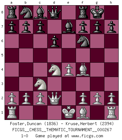 Last move : 1-0 2024 July 6 12:59:31 [Event "FICGS__CHESS__THEMATIC_TOURNAMENT__000267"] [Site "FICGS"] [Date "2024.06.30"] [Round "1"] [White "Foster,Duncan"] [Black "Kruse,Herbert"] [Result "1-0"] [WhiteElo "1836"] [BlackElo "2394"] 1.e4 e5 2.Nf3 d6 3.d4 exd4 4.Nxd4 Nf6 5.Nc3 Be7 6.Bf4 O-O 7.Qd2 1-0 Follow this game move after move (download)At this time Fischer is simply a level above all the best Chessplayers in the world. (John Jacobs) Vom Schach wurde gesagt das Leben sei dafür nicht lange genug. Aber das ist der Fehler des Lebens, nicht des Schach'. (Irving Chernev) Yo nunca en mi vida he jugado la Defensa Francesa, que viene siendo la más aburrida de todas las Aperturas. (Wilhelm Steinitz) Il s'avisa de me proposer d'apprendre les échecs qu'il jouait un peu... me voilà forcené des échecs. J'achète un échiquier, je m'enferme dans ma chambre, j'y passe des jours et des nuits à vouloir apprendre par cur toutes les parties. (Jean-Jacques Rousseau, Confessions) It's only after you lost everything, Tyler says, that you're free to do anything. (Chuck Palahniuk, Fight Club)
