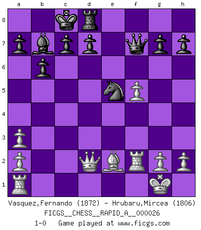 Last move : 1-0 2007 December 13 8:52:35 [Event "FICGS__CHESS__RAPID_A__000026"] [Site "FICGS"] [Date "2007.09.19"] [Round "1"] [White "Vasquez,Fernando"] [Black "Hrubaru,Mircea"] [Result "1-0"] [WhiteElo "1872"] [BlackElo "1806"] 1.e4 e5 2.Nf3 Nc6 3.d4 exd4 4.Nxd4 Bc5 5.Be3 Qf6 6.c3 Nge7 7.Bc4 b6 8.O-O Bb7 9.f4 O-O-O 10.e5 Qh6 11.Qd2 f6 12.Na3 Nxd4 13.cxd4 Bxa3 14.f5 Qh5 15.bxa3 fxe5 16.Be2 Qf7 17.dxe5 Nc6 18.Bg5 Nxe5 19.Bxd8 Rxd8 20.Rf2 1-0 This chess game has been lost on time (started : 2007.09.19 12:30:22) Scotch game Kingside Castling by player White (move 8) Queenside Castling by player Black (move 9) Player White won this chess game. Follow this game move after move (download)Bobby is the most misunderstood, misquoted celebrity walking the face of this earth. (Yasser Seirawan) Sicherlich können nur Meister einen Stil haben. Daß ein nicht-Meister auch nur ein einziges Mal in seinem Leben eine Partie folgerecht durchführte, habe ich niemals bemerkt. (Emanuel Lasker) Muchos jugadores de Ajedrez se sorprendían cuando después de la partida, Fischer explicaba con calma: 'Yo ya había analizado esta posibilidad' en una posición en la cual yo creía que no era posible de prever desde la apertura. (Mikhail Tal) Roi des jeux et jeu des rois, les échecs portent en eux un sentiment d'infini. Ils donnent à celui qui s'est efforcé d'en approfondir les arcanes l'impression de n'être pas à la mesure de l'homme; en fait, ils constituent un résumé de l'univers, un microcosme, et figurent cette grande échelle qui, dans les plans de la lumière descend jusqu'à la matière, qui des abîmes insondables remonte jusqu'en l'infini de Dieu. (Pyrame) We cannot be sure of having something to live for unless we are willing to die for it. (Ernesto Che Guevara)