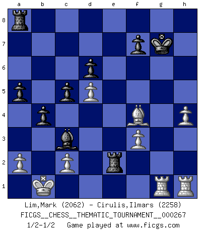 Last move : 1/2-1/2 2024 July 31 15:58:54 [Event "FICGS__CHESS__THEMATIC_TOURNAMENT__000267"] [Site "FICGS"] [Date "2024.06.30"] [Round "1"] [White "Lim,Mark"] [Black "Cirulis,Ilmars"] [Result "1/2-1/2"] [WhiteElo "2062"] [BlackElo "2258"] 1.e4 e5 2.Nf3 d6 3.d4 exd4 4.Nxd4 Nf6 5.Nc3 Be7 6.Bf4 O-O 7.Qd2 Nc6 8.O-O-O Nxd4 9.Qxd4 a6 10.f3 b5 11.g4 c5 12.Qe3 b4 13.Nd5 Nxd5 14.exd5 Bh4 15.Bg3 Bf6 16.h4 Re8 17.Qd2 h5 18.gxh5 Bf5 19.h6 a5 20.Bd3 Bxd3 21.Qxd3 Bd4 22.Bf4 Bxb2+ 23.Kb1 Qf6 24.Bg5 Qc3 25.Qxc3 Bxc3 26.hxg7 Kxg7 27.Rdg1 Re2 28.Bf4 1/2-1/2 Follow this game move after move (download)Only the player with the initiative has the right to attack. (Wilhelm Steinitz) Mit sehr nachdenklichem Gesicht schreitet Bobby durch den Turniersaal. Was ist passiert?, fragt Lombardy. Ich stehe schlecht, antwortet Fischer. Lombardy: Dann biete doch einfach Remis an. Fischer: So schlecht stehe ich nun auch wieder nicht! (Robert James Fischer) El juego de Damas es para vagabundos. (Paul Morphy) Les Echecs ont trois composantes : le temps, l'espace et le matériel en dernier. (Mikhail Tal) For a mechanic, you seem to do an excessive amount of thinking. (C-3PO in Star Wars ep.2)