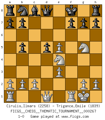 Last move : 1-0 2024 August 11 18:38:15 [Event "FICGS__CHESS__THEMATIC_TOURNAMENT__000267"] [Site "FICGS"] [Date "2024.06.30"] [Round "1"] [White "Cirulis,Ilmars"] [Black "Trigance,Emile"] [Result "1-0"] [WhiteElo "2258"] [BlackElo "1839"] 1.e4 e5 2.Nf3 d6 3.d4 Nf6 4.dxe5 Nxe4 5.Be3 d5 6.Nbd2 Bc5 7.Nxe4 Bxe3 8.Bb5+ Kf8 9.fxe3 c6 10.O-O cxb5 11.Nfg5 1-0 Follow this game move after move (download)Chess is like life. (Boris Spassky) Wie, soll nun auch die Opposition abgeschafft werden? Ja, es tut mir leid, Ihnen diesen Schmerz nicht ersparen zu können. (Aaron Nimzowitsch) Las combinaciones han sido siempre el aspecto más intrigante del Ajedrez. Los Maestros las buscan, el público las aplauden, los críticos las alaban. La razón se debe a que las combinaciones hacen posible que el Ajedrez sea más que un ejercicio matemático con una carencia de vida. Ellas son la poesía del juego, son del Ajedrez lo que la melodía es de la música. Ellas representan el triunfo de la mente sobre la materia. (Reuben Fine) Nous sommes les pions de la mystérieuse partie d'Echecs jouée par Dieu. Il nous déplace, nous arrête, nous pousse encore, puis nous lance un à un dans la boîte du Néant. Epitaphe sur la tombe de David Janowsky (1868-1927). Computers are like Old Testament gods; lots of rules and no mercy. (Joseph Campbell)