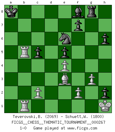 Last move : 1-0 2025 January 8 11:55:9 [Event "FICGS__CHESS__THEMATIC_TOURNAMENT__000267"] [Site "FICGS"] [Date "2024.06.30"] [Round "1"] [White "Teverovski,Bogoljub"] [Black "Schuett,Wilhelm"] [Result "1-0"] [WhiteElo "2069"] [BlackElo "1800"] 1.e4 e5 2.Nf3 d6 3.Bc4 h6 4.d4 Qe7 5.O-O Nf6 6.Nc3 c6 7.a4 Bg4 8.dxe5 dxe5 9.h3 Bxf3 10.Qxf3 Nbd7 11.a5 O-O-O 12.Be3 Kb8 13.Rfb1 g5 14.b4 Rg8 15.b5 c5 16.b6 a6 17.Qe2 g4 18.Bxa6 gxh3 19.g3 h2+ 20.Kh1 Ne8 21.Nd5 Qe6 22.Bxb7 Kxb7 23.Qb5 Rb8 24.a6+ Ka8 25.a7 Rxb6 26.Nxb6+ Nxb6 27.Ra6 Nc7 28.Qxb6 Qxb6 29.Raxb6 Ne6 30.Rb8+ Kxa7 31.R8b7+ Ka8 32.R7b5 1-0 Follow this game move after move (download)Chess is war over the board. The object is to crush the opponents mind. (Bobby Fischer) Ohne Leiden bildet sich kein Charakter. (Ernst Freiherr von Feuchtersleben) La batalla por la última verdad nunca sera ganada. Y es por eso que el Ajedrez es tan fascinante. (Hans Kmoch) En blitz, le Cavalier l'emporte sur le Fou. (Vlastimil Hort) Success without honor is an unseasoned dish; it will satisfy your hunger, but it won't taste good. (Joe Paterno)