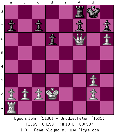 Last move : 1-0 2024 September 8 5:50:15 [Event "FICGS__CHESS__RAPID_B__000397"] [Site "FICGS"] [Date "2024.07.03"] [Round "1"] [White "Dyson,John"] [Black "Brodie,Peter"] [Result "1-0"] [WhiteElo "2138"] [BlackElo "1692"] 1.e4 e5 2.Nf3 Nc6 3.Bb5 Nf6 4.d3 Bc5 5.Bxc6 bxc6 6.Nxe5 d6 7.Nxc6 Qd7 8.Na5 Bb4+ 9.Bd2 Bxa5 10.Bxa5 Qb5 11.Bc3 O-O 12.Bxf6 gxf6 13.Nc3 Qe8 14.Nd5 Qd8 15.Qf3 Kg7 16.Qg3+ Kh8 17.Qh4 Bb7 18.Nxf6 Kg7 19.Qg5+ Kh8 20.Qh6 Qxf6 21.Qxf6+ Kg8 22.h4 Rae8 23.Rh3 Bxe4 24.dxe4 Rxe4+ 25.Kd2 Rg4 26.h5 Rg7 27.h6 Rg6 28.Rg3 Rxg3 29.fxg3 1-0 Follow this game move after move (download)Let the perfectionist play postal. (Yasser Seirawan) Weshalb minderdergeübte Spieler mit g2-g4 beginnen? Die betreffenden sind unschlüssig, ob sie nun rechts (h4) oder links (f4) beginnen sollen, und in ihrer Ratlosigkeit entschliessen sie sich nach guter Bürgerart dazu, den goldenen Mittelweg zu wählen. (Aaron Nimzowitsch) La vida es como un juego de Ajedrez, cambiando con cada movimiento. (Proverbio Chino) On est toujours la mazette de quelqu'un d'autre. (Anonyme) We cannot be sure of having something to live for unless we are willing to die for it. (Ernesto Che Guevara)