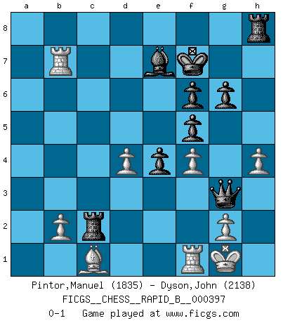 Last move : 0-1 2024 August 5 3:8:54 [Event "FICGS__CHESS__RAPID_B__000397"] [Site "FICGS"] [Date "2024.07.03"] [Round "1"] [White "Pintor,Manuel"] [Black "Dyson,John"] [Result "0-1"] [WhiteElo "1835"] [BlackElo "2138"] 1.e4 c6 2.f4 d5 3.exd5 cxd5 4.Nf3 Nc6 5.d4 Bf5 6.Bd3 e6 7.Bxf5 exf5 8.O-O Nf6 9.Nc3 Be7 10.Ne5 O-O 11.Be3 Re8 12.Qf3 Rc8 13.a3 Na5 14.h3 Ne4 15.Nxe4 dxe4 16.Qh5 g6 17.Qe2 f6 18.Nxg6 hxg6 19.c3 Qd5 20.Qf2 Qb3 21.Rab1 Nc4 22.Qg3 Kf7 23.h4 Rh8 24.Bc1 Nxa3 25.Ra1 Nc2 26.Rxa7 Nxd4 27.cxd4 Qxg3 28.Rxb7 Rc2 0-1 Follow this game move after move (download)Many Chess players were surprised when after the game, Fischer quietly explained: 'I had already analyzed this possibility' in a position which I thought was not possible to foresee from the opening. (Mikhail Tal) Kleine Schachspieler machen Mist, und große Schachspieler machen Mist, aber große machen weniger Mist. (Fritz Sämisch) Preferería tener un Peón que un dedo. (Reuben Fine) Tout change constamment, y compris dans le monde des Echecs. (Botvinnik) Life is the sum of all your choices. (Albert Camus)