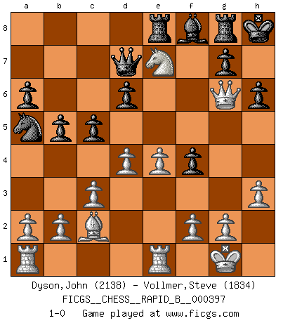 Last move : 1-0 2024 September 2 14:34:9 [Event "FICGS__CHESS__RAPID_B__000397"] [Site "FICGS"] [Date "2024.07.03"] [Round "1"] [White "Dyson,John"] [Black "Vollmer,Steve"] [Result "1-0"] [WhiteElo "2138"] [BlackElo "1834"] 1.e4 e5 2.Nf3 Nc6 3.Bb5 a6 4.Ba4 Nf6 5.d3 d6 6.c3 Bg4 7.O-O Be7 8.Re1 O-O 9.h3 Bh5 10.Nbd2 h6 11.Nf1 b5 12.Bb3 Qd7 13.Ng3 Bxf3 14.Qxf3 Na5 15.Bc2 c5 16.Nf5 Kh7 17.Qg3 Rg8 18.Qh4 Nd5 19.Qh5 Nf4 20.Bxf4 exf4 21.Qxf7 Rae8 22.d4 Kh8 23.Qg6 Bf8 24.Ne7 1-0 Follow this game move after move (download)The passion for playing Chess is one of the most unaccountable in the world. (H.G. Wells) Sie bekommen vielleicht den Eindruck, dass die Spitzenspieler überhaupt gar nicht so stark sind. Aber das stimmt nicht. Es ist eine Illusion. Mit einem Computer an der Seite ist es sehr leicht, Urteile zu fällen, aber wenn man alleine am Brett sitzt, sieht die Sache ganz anders aus. (Vladimir Kramnik) El Ajedrez es el gimnasio de la mente. (Blaise Pascal) La conception d'un plan est le processus par lequel un joueur exploite les avantages de sa position tout en s'efforçant d'en réduire au minimum les inconvénients. Afin de garantir le succès, un plan doit toujours se fonder sur un diagnostic objectif des particularités d'une position. La conception d'un plan est d'autant plus difficile que la position est équilibrée, et grandement facilitée lorsqu'il n'existe qu'un seul plan susceptible de répondre aux exigences de la position. (Harry Golombek) Creativity is inventing, experimenting, growing, taking risks, breaking rules, making mistakes, and having fun. (Mary Lou Cook)