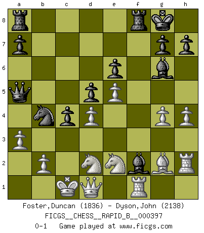 Last move : 0-1 2024 August 24 14:35:23 [Event "FICGS__CHESS__RAPID_B__000397"] [Site "FICGS"] [Date "2024.07.03"] [Round "1"] [White "Foster,Duncan"] [Black "Dyson,John"] [Result "0-1"] [WhiteElo "1836"] [BlackElo "2138"] 1.e4 c6 2.d4 d5 3.f3 Qb6 4.e5 e6 5.Ne2 c5 6.c3 Nc6 7.Qb3 Qc7 8.Be3 f6 9.f4 fxe5 10.fxe5 Bd7 11.Nd2 Nh6 12.h3 Nf5 13.Bf2 Be7 14.g4 Nh4 15.O-O-O c4 16.Qc2 O-O 17.Bxh4 Bxh4 18.Bg2 Be8 19.Rdf1 Bg6 20.Qd1 Bf2 21.h4 Qa5 22.a3 b5 23.Rh2 b4 24.cxb4 Nxb4 0-1 Follow this game move after move (download)In blitz, the Knight is stronger than the Bishop. (Vlastimil Hort) Darum geht es im Schach. Einen Tag gibst du deinem Gegner eine Lektion, am nächsten Tag gibt er dir eine. (Robert James Fischer) Fischer deseaba darle a los Rusos una sopa de su propia medicina. (Larry Evans) Le moment que je préfère le plus dans une rencontre, c'est celui où je sens que la personnalité de l'adversaire se brise. (Robert Fischer) I fear not the man who has practiced 10,000 kicks once, but I fear the man who has practiced one kick 10,000 times. (Bruce Lee)