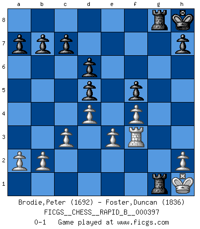 Last move : 0-1 2024 September 26 15:27:4 [Event "FICGS__CHESS__RAPID_B__000397"] [Site "FICGS"] [Date "2024.07.03"] [Round "1"] [White "Brodie,Peter"] [Black "Foster,Duncan"] [Result "0-1"] [WhiteElo "1692"] [BlackElo "1836"] 1.Nf3 f5 2.d4 Nf6 3.Bf4 d6 4.Nc3 e6 5.e3 Be7 6.Be2 O-O 7.O-O Nbd7 8.Bc4 Nb6 9.Bb3 Nbd5 10.Nxd5 Nxd5 11.Bxd5 exd5 12.Rc1 g5 13.Bxg5 Bxg5 14.Nxg5 Qxg5 15.f4 Qe7 16.Qe2 Rf7 17.Kh1 Qe4 18.Qf3 Qe6 19.Qg3+ Kh8 20.Rf3 Bd7 21.Qf2 Rg8 22.g3 Qe4 23.c3 Rfg7 24.Rg1 Be8 25.Re1 Bh5 26.g4 Bxg4 27.Rf1 Bxf3+ 28.Qxf3 Qxf3+ 29.Rxf3 Rg1+ 0-1 Follow this game move after move (download)Via the squares on the chessboard, the Indians explain the movement of time and the age, the higher influences which control the world and the ties which link Chess with the human soul. (Al-Masudi) Charakterschwächen offenbaren sich normalerweise während einer Schachpartie. (Garry Kasparov) Aún el Rey más flojo huye despavorido ante la amenaza de un Jaque doble. (Aaron Nimzowitsch) Donnez-moi un Cavalier en 6e et je gagnerais toutes mes parties. (Steinitz) History is a gallery of pictures in which there are few originals and many copies. (Alexis de Tocqueville)