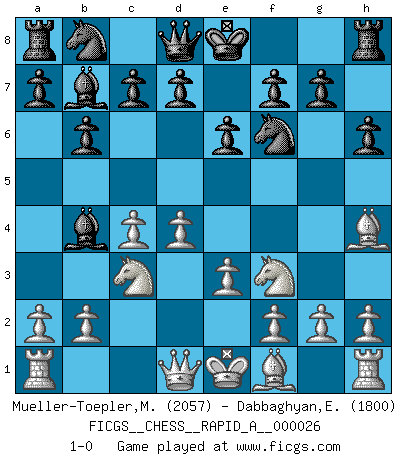 Last move : 1-0 2007 October 27 20:33:34 [Event "FICGS__CHESS__RAPID_A__000026"] [Site "FICGS"] [Date "2007.09.19"] [Round "1"] [White "Mueller-Toepler,Michael"] [Black "Dabbaghyan,Edwin"] [Result "1-0"] [WhiteElo "2057"] [BlackElo "1800"] 1.c4 Nf6 2.Nf3 e6 3.d4 b6 4.Nc3 Bb4 5.Bg5 Bb7 6.e3 h6 7.Bh4 1-0 This chess game has been lost on time (started : 2007.09.19 12:30:22) English Opening Player White won this chess game. Follow this game move after move (download)All Chess players should have a hobby. (Savielly Tartakower) Wenn Du einsam bist, wenn Du Dich in der Welt wie ein Fremder fühlst, spiele Schach. Das wird Deinen Geist erheben und Dein Ratgeber im Kampf sein. (Aristoteles) Siempre es mucho mejor sacrificar las piezas de tu oponente. (Savielly Tartakover) La conception d'un plan est le processus par lequel un joueur exploite les avantages de sa position tout en s'efforçant d'en réduire au minimum les inconvénients. Afin de garantir le succès, un plan doit toujours se fonder sur un diagnostic objectif des particularités d'une position. La conception d'un plan est d'autant plus difficile que la position est équilibrée, et grandement facilitée lorsqu'il n'existe qu'un seul plan susceptible de répondre aux exigences de la position. (Harry Golombek) Creativity involves breaking out of established patterns in order to look at things in a different way. (Edward De Bono)