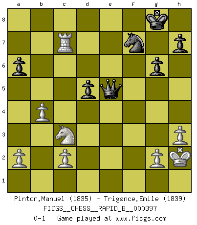 Last move : 0-1 2024 September 4 22:30:52 [Event "FICGS__CHESS__RAPID_B__000397"] [Site "FICGS"] [Date "2024.07.03"] [Round "1"] [White "Pintor,Manuel"] [Black "Trigance,Emile"] [Result "0-1"] [WhiteElo "1835"] [BlackElo "1839"] 1.e4 e6 2.f4 d5 3.exd5 exd5 4.d4 Nf6 5.Nf3 Be7 6.Bd3 Bg4 7.O-O O-O 8.h3 Bxf3 9.Qxf3 c5 10.dxc5 Bxc5+ 11.Kh1 Re8 12.Nc3 Nc6 13.Qg3 Bd6 14.Qh4 g6 15.f5 Be7 16.fxg6 fxg6 17.Bg5 Nh5 18.Bxe7 Rxe7 19.Qg4 Qd6 20.Rf3 Ne5 21.Nb5 Qc5 22.b4 Qb6 23.Qg5 Rae8 24.Re3 Nf7 25.Qxe7 Rxe7 26.Rxe7 Qf6 27.Rxb7 Qxa1+ 28.Kh2 Qe5+ 29.Kg1 Nf4 30.Bf1 Ne2+ 31.Bxe2 Qxe2 32.Rc7 a6 33.Nc3 Qe1+ 34.Kh2 Qe5+ 0-1 Follow this game move after move (download)A player surprised is half beaten. (Proverb) Vom Schach wurde gesagt das Leben sei dafür nicht lange genug. Aber das ist der Fehler des Lebens, nicht des Schach'. (Irving Chernev) No es una movida, aún la mejor movida que tu debas buscar, sino un plan comprensible. (Eugene Znosko-Borovsky) A chaque perte on perd un peu de soi. (Joël Lautier) If you have any trouble condescending, find a Unix user to show you how it's done. (Scott Adams)