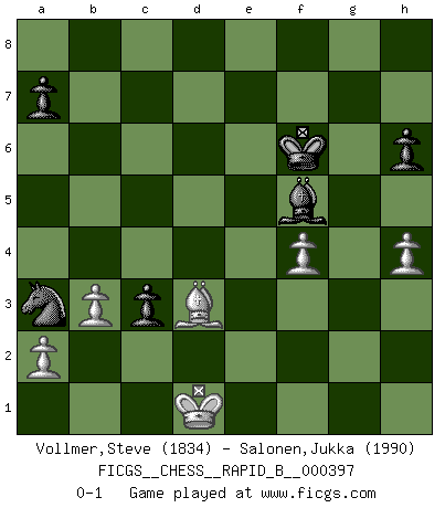 Last move : 0-1 2024 September 29 11:43:30 [Event "FICGS__CHESS__RAPID_B__000397"] [Site "FICGS"] [Date "2024.07.03"] [Round "1"] [White "Vollmer,Steve"] [Black "Salonen,Jukka"] [Result "0-1"] [WhiteElo "1834"] [BlackElo "1990"] 1.d4 d5 2.c4 e6 3.Nc3 Nf6 4.Bg5 Be7 5.e3 O-O 6.Bd3 c5 7.Nf3 dxc4 8.Bxc4 cxd4 9.Nxd4 Bd7 10.O-O h6 11.Bh4 Nc6 12.Nxc6 Bxc6 13.Qxd8 Rfxd8 14.Rfd1 Rac8 15.Rac1 Kf8 16.Rxd8+ Rxd8 17.Rd1 Rxd1+ 18.Nxd1 g5 19.Bg3 Ne4 20.Be5 Bd6 21.Bxd6+ Nxd6 22.Bd3 e5 23.Nc3 e4 24.Bb1 f5 25.Kf1 Nc4 26.b3 Na3 27.Ke2 b5 28.f3 exf3+ 29.gxf3 b4 30.Bxf5 bxc3 31.f4 Bb5+ 32.Kd1 gxf4 33.exf4 Kg7 34.Be4 Kf7 35.h3 Bd7 36.h4 Kf6 37.Bd3 Bf5 0-1 Follow this game move after move (download)Chess opens and enriches your mind. (Saudin Robovic) Ich kämpfe solange mein Gegner einen Fehler machen kann. (Emanuel Lasker) El Ajedrez es el gimnasio de la mente. (Blaise Pascal) C'est une question de caractère, Beaucoup de gens perdent leur motivation très vite. D'autres, ils sont rares, peuvent la conserver très longtemps. J'aime les échecs, encore aujourd'hui je suis heureux d'analyser des parties. J'aime toujours gagner, je déteste encore perdre. Bien jouer est important pour mon intégrité intellectuelle et morale. Et puis les échecs vivent en ce moment une période historique grâce à Internet. Ils se développent dans les systèmes éducatifs à travers le monde. Ils sortent de leur ghetto, et c'est mon rôle de mener à bien cette révolution. (Gary Kasparov) You can't play chess if you're groggy from pills. (Anatoly Karpov)