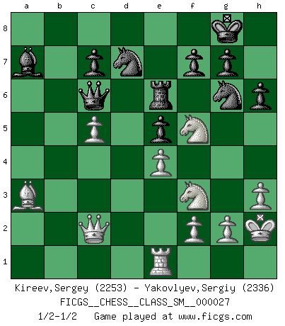 Last move : 1/2-1/2 2024 July 14 12:30:34 [Event "FICGS__CHESS__CLASS_SM__000027"] [Site "FICGS"] [Date "2024.07.04"] [Round "1"] [White "Kireev,Sergey"] [Black "Yakovlyev,Sergiy"] [Result "1/2-1/2"] [WhiteElo "2253"] [BlackElo "2336"] 1.e4 e5 2.Nf3 Nc6 3.Bc4 Bc5 4.c3 Nf6 5.d3 d6 6.O-O a6 7.Re1 O-O 8.a4 Ba7 9.h3 h6 10.Nbd2 Re8 11.b4 Be6 12.Bxe6 Rxe6 13.Bb2 Ne7 14.Nf1 Ng6 15.c4 b5 16.axb5 axb5 17.Ng3 bxc4 18.dxc4 Qe8 19.Qc2 Qc6 20.Rec1 Bb6 21.Rxa8+ Qxa8 22.Kh2 Qc6 23.c5 dxc5 24.bxc5 Ba7 25.Ba3 Nd7 26.Nf5 Nf6 27.Re1 Nd7 1/2-1/2 Follow this game move after move (download)It is not enough to be a good player... you must also play well. (Siegbert Tarrasch) Ich trinke, ich rauche, ich spiele, ich liebe Frauen aber Fernschach ist ein Laster, das ich nicht habe. (Mikhail Nekhemyevich Tal) Si un gobernante no entiende al Ajedrez, ¿como puede governar él un reinado?. (El Rey Khusros II) D'abord les bases : Jouez et étudiez, puis étudiez et jouez, ensuite jouez et étudiez, puis étudiez et jouez. Deuxièmement : Donnez toujours le meilleur de vous-même ! (Ken Smith) Computers are like Old Testament gods; lots of rules and no mercy. (Joseph Campbell)