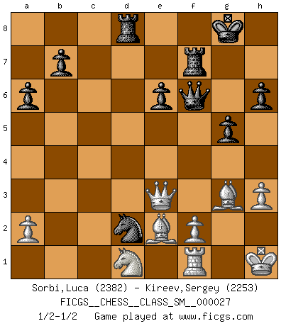 Last move : 1/2-1/2 2024 July 6 10:34:33 [Event "FICGS__CHESS__CLASS_SM__000027"] [Site "FICGS"] [Date "2024.07.04"] [Round "1"] [White "Sorbi,Luca"] [Black "Kireev,Sergey"] [Result "1/2-1/2"] [WhiteElo "2382"] [BlackElo "2253"] 1.e4 c5 2.Nf3 d6 3.d4 cxd4 4.Nxd4 Nf6 5.Nc3 a6 6.Be3 Ng4 7.Bc1 Nf6 8.Be3 Ng4 9.Bg5 h6 10.Bh4 g5 11.Bg3 Bg7 12.h3 Ne5 13.Nf5 Bxf5 14.exf5 Nbc6 15.Nd5 Qa5+ 16.c3 e6 17.fxe6 fxe6 18.Ne3 Nf3+ 19.gxf3 Bxc3+ 20.bxc3 Qxc3+ 21.Qd2 Qxa1+ 22.Nd1 Rc8 23.Bd3 O-O 24.O-O Nd4 25.Kg2 Nxf3 26.Qe3 Qf6 27.Bxd6 Nh4+ 28.Kg1 Nf3+ 29.Kh1 Rf7 30.Bg3 Rd8 31.Be2 Nd2 32.Re1 Nf3 33.Rf1 Nd2 1/2-1/2 Follow this game move after move (download)Chess is thirty to forty percent psychology. You don't have this when you play a computer. I can't confuse it. (Judith Polgar) Spielt Blackmar-Diemer-Gambit, und das Matt kommt von selbst! (Emil Joseph Diemer) Solo los afeminados hacen el Enroque. (Rob Sillars) Il n'y a pas de prix trop élevé au scalp de l'ennemi. (Koblentz) The only thing that matters is the evidence. (Horatio Caine, C.S.I. Miami)