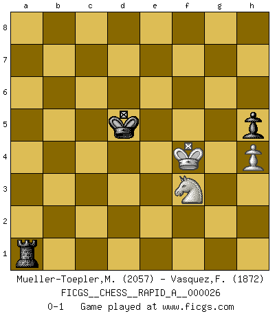Last move : 0-1 2007 December 8 16:15:0 [Event "FICGS__CHESS__RAPID_A__000026"] [Site "FICGS"] [Date "2007.09.19"] [Round "1"] [White "Mueller-Toepler,Michael"] [Black "Vasquez,Fernando"] [Result "0-1"] [WhiteElo "2057"] [BlackElo "1872"] 1.c4 e5 2.Nc3 Nf6 3.Nf3 Nc6 4.g3 d5 5.cxd5 Nxd5 6.Bg2 Nxc3 7.bxc3 e4 8.Ng1 Qd5 9.d3 Bf5 10.Rb1 Qxa2 11.Rxb7 O-O-O 12.Rb5 g6 13.g4 Qa6 14.Rb1 Bxg4 15.Bxe4 Bg7 16.d4 Rhe8 17.Bd3 Qa5 18.Qd2 Bh6 19.Qxh6 Nxd4 20.Rb4 c5 21.Rc4 Be6 22.Rxc5+ Qxc5 23.cxd4 Rxd4 24.Kf1 Qd5 25.f3 Bf5 26.Bxf5+ gxf5 27.Be3 Rd1+ 28.Kg2 Qc4 29.Qg5 Re6 30.Qxf5 Rd5 31.Qh3 Kb7 32.f4 a5 33.Qf3 Qc6 34.Bf2 Rd1 35.f5 Re8 36.h4 Qxf3+ 37.Nxf3 Rxh1 38.Kxh1 a4 39.Bd4 Rxe2 40.Ne5 a3 41.Nxf7 a2 42.Ne5 Rf2 43.Bc3 h5 44.f6 Rxf6 45.Kg2 Rf4 46.Kg3 Ra4 47.Ba1 Re4 48.Nf3 Kc6 49.Kg2 Kd5 50.Kf2 Rb4 51.Ke3 Rb3+ 52.Kf4 Rb1 53.Bh8 a1Q 54.Bxa1 Rxa1 0-1 English Opening Queenside Castling by player Black (move 11) 10 pieces endgame at move 39 : White KBNPP , Black KRPPP WHITE : King + 1 Bishop 1 Knight 2 Pawns BLACK : King + 1 Rook 3 Pawns 9 pieces endgame at move 41 : White KBNPP , Black KRPP WHITE : King + 1 Bishop 1 Knight 2 Pawns BLACK : King + 1 Rook 2 Pawns 8 pieces endgame at move 44 : White KBNP , Black KRPP WHITE : King + 1 Bishop 1 Knight 1 Pawn BLACK : King + 1 Rook 2 Pawns Promotion Queen by player Black (move 53) 7 pieces endgame at move 54 : White KBNP , Black KRP WHITE : King + 1 Bishop 1 Knight 1 Pawn BLACK : King + 1 Rook 1 Pawn 6 pieces endgame at move 54 : White KNP , Black KRP WHITE : King + 1 Knight 1 Pawn BLACK : King + 1 Rook 1 Pawn Player Black won this chess game. Follow this game move after move (download)The Chess pieces are the block alphabet which shapes thoughts; and these thoughts, although making a visual design on the chessboard, express their beauty abstractly, like a poem. (Marcel Duchamp) Mein Gehirn das ist mein zweitwichtigstes Organ [Aus dem Film: Der Schläfer]. (Woody Allen) No nos podemos resistir a la fascinación de un sacrificio ya que la pasión por los sacrificios es parte de la naturaleza de un jugador de Ajedrez. (Rudolf Spielman) Karpov est une pièce de musée. (Garry Kasparov) The Movers & Shakers of this world are those who play chess in the mornings and go to the disco in the evenings. (Dinesh De Silva)