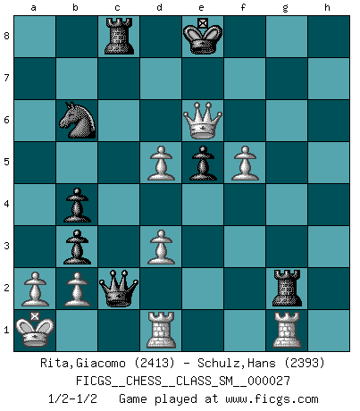Last move : 1/2-1/2 2024 July 30 11:20:38 [Event "FICGS__CHESS__CLASS_SM__000027"] [Site "FICGS"] [Date "2024.07.04"] [Round "1"] [White "Rita,Giacomo"] [Black "Schulz,Hans"] [Result "1/2-1/2"] [WhiteElo "2413"] [BlackElo "2393"] 1.e4 c5 2.Nf3 d6 3.d4 cxd4 4.Nxd4 Nf6 5.Nc3 a6 6.Be3 e5 7.Nb3 Be6 8.f3 h5 9.Qd2 Nbd7 10.O-O-O Be7 11.Kb1 Rc8 12.h3 b5 13.Bd3 h4 14.f4 Qc7 15.Rhe1 O-O 16.f5 Bc4 17.g4 hxg3 18.Rg1 b4 19.Nd5 Nxd5 20.exd5 Bh4 21.Bg5 Bxg5 22.Qxg5 Bxd3 23.cxd3 f6 24.Qxg3 Nb6 25.h4 a5 26.h5 a4 27.h6 axb3 28.hxg7 Rf7 29.Qh4 Rxg7 30.Qxf6 Qc2+ 31.Ka1 Rg2 32.Qe6+ Kf8 33.Qxd6+ Ke8 34.Qe6+ 1/2-1/2 Follow this game move after move (download)Winning isn't everything... but losing is nothing. (Mednis) Obendrein hat der FIDE-Präsident den Revolutionsführer Gaddafi zum »Großmeister« ernannt, am Ende der WM. Das ist lächerlich! (Joel Lautier) Dios mío, Bobby Fischer juega tan simple. (Alexei Suetin) Il n'y a plus de joueurs du niveau de Jacob Murray dont la seule quête est le beau jeu, le plaisir de voir les pièces construire quelque chose. Sur 10 idées à la minute, 9 seront sans intérêt, la dernière s'avèrera géniale. (Christian Bauer) Men never do evil so completely and cheerfully as when they do it from religious conviction. (Blaise Pascal)