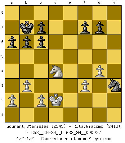 Last move : 1/2-1/2 2024 August 4 6:36:43 [Event "FICGS__CHESS__CLASS_SM__000027"] [Site "FICGS"] [Date "2024.07.04"] [Round "1"] [White "Gounant,Stanislas"] [Black "Rita,Giacomo"] [Result "1/2-1/2"] [WhiteElo "2245"] [BlackElo "2413"] 1.b3 e5 2.Bb2 Nc6 3.e3 Nf6 4.Bb5 Qe7 5.Ne2 a6 6.Bxc6 dxc6 7.d3 Bg4 8.h3 Bh5 9.Ba3 Qe6 10.Bxf8 Rxf8 11.e4 O-O-O 12.g4 Bg6 13.Qc1 h5 14.f3 Nd7 15.Qe3 hxg4 16.hxg4 Rh8 17.Rxh8 Rxh8 18.Nbc3 Rh1+ 19.Ng1 b6 20.O-O-O Qf6 21.Nge2 Rh3 22.Rf1 Nc5 23.d4 exd4 24.Nxd4 Kb7 25.Nce2 Nxe4 26.Nf4 Ng3 27.Rg1 Qg5 28.Qd2 Rh1 29.Rxh1 Nxh1 30.Nxg6 Qxg6 31.Nf5 Qf6 32.Qd7 Nf2 33.Qd4 Qxd4 34.Nxd4 Nh3 35.Kd2 1/2-1/2 Follow this game move after move (download)Is Bobby Fischer quite sane ? (Salo Flohr) Die Arbeit ist etwas Unnatürliches. Die Faulheit allein ist göttlich. (Anatole France) En la vida, como en el Ajedrez, los Peones propios obstruyen nuestro camino. La gran fortuna de un hombre, su comodidad, placer, hijos, libros, que deberían ayudarle a ganar, con mucha frecuencia lo ponen en Jaque Mate. (Charles Buxton) Un millionnaire : 'Monsieur Steinitz ! Vous ne participez aux tournois que pour l'argent, alors que moi je n'y viens que pour l'honneur.' Steinitz : 'Chacun joue pour ce qu'il n'a pas'... Unless I accept my faults I will most certainly doubt my virtues. (Hugh Prather)
