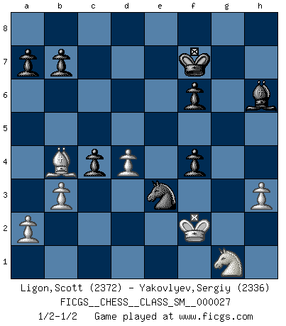 Last move : 1/2-1/2 2024 July 25 17:2:58 [Event "FICGS__CHESS__CLASS_SM__000027"] [Site "FICGS"] [Date "2024.07.04"] [Round "1"] [White "Ligon,Scott"] [Black "Yakovlyev,Sergiy"] [Result "1/2-1/2"] [WhiteElo "2372"] [BlackElo "2336"] 1.e4 e5 2.f4 exf4 3.Bc4 Nc6 4.Nf3 g5 5.d4 Bg7 6.h4 h6 7.Nc3 d6 8.Qd3 Bd7 9.hxg5 hxg5 10.Rxh8 Bxh8 11.e5 Kf8 12.Bd2 Bg7 13.e6 Nb4 14.Qf5 Nh6 15.Qh7 Bxe6 16.Bxe6 Qe7 17.Ne4 Qxe6 18.Bxb4 Re8 19.Nfxg5 Qg4 20.Kf1 Nf5 21.Qh3 Qxh3 22.gxh3 f6 23.Nxd6 cxd6 24.Nf3 Kf7 25.Kf2 d5 26.b3 Bh6 27.c4 Ne3 28.Rc1 Rg8 29.Rg1 Rxg1 30.Nxg1 dxc4 1/2-1/2 Follow this game move after move (download)What is the difference between chess and football? Everybody understands football, but nobody plays it. Everybody plays chess, but nobody understands it. Everything is relative. (Vladimir Kramnik) Als er Schachweltmeister wurde ließ er praktisch alle stärksten Sovietspieler für sich arbeiten. Wenn ein auch nur mittelmässiger Meister ein Spezialist für eine bestimmte Eröffnung war, wurde er von Karpov gerufen. Das wurde alles geheim gehalten. (Mikhail Moiseyevich Botvinik) El Ajedrez no es una pizca de inferior al violín, y tenemos un gran número de violinistas profesionales. (Mikhail Botvinnik) J'ai vu le vaincu d'Echecs jouer des années durant dans l'espoir de la fête de la victoire. Car tu es plus riche de ce qu'elle existe si même elle n'est point pour toi. Ainsi de la perle du fond des mers. (Antoine de Saint-Exupéry) The question of whether computers can think is just like question of whether submarines can swim. (Edsger W. Dijkstra)