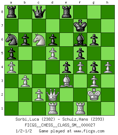 Last move : 1/2-1/2 2024 July 6 18:42:1 [Event "FICGS__CHESS__CLASS_SM__000027"] [Site "FICGS"] [Date "2024.07.04"] [Round "1"] [White "Sorbi,Luca"] [Black "Schulz,Hans"] [Result "1/2-1/2"] [WhiteElo "2382"] [BlackElo "2393"] 1.e4 c5 2.Nf3 d6 3.d4 cxd4 4.Nxd4 Nf6 5.Nc3 a6 6.Be3 e5 7.Nb3 Be6 8.f3 h5 9.Qd2 Nbd7 10.Nd5 Bxd5 11.exd5 g6 12.Be2 Bg7 13.O-O b6 14.a4 O-O 15.Rad1 Qc8 16.Nc1 Re8 17.Na2 e4 18.f4 Ng4 19.Bxg4 hxg4 20.Nb4 f5 21.Nc6 a5 22.b3 Kf7 23.g3 Nc5 24.h4 Bf6 25.Kg2 Na6 26.Nd4 Rb8 27.Nc6 Ra8 1/2-1/2 Follow this game move after move (download)The King is a fighting piece. Use it ! (Wilhelm Steinitz) Es hat in meinem Leben Zeiten gegeben, in denen das Schachspiel, wenn nicht zum Lebenszweck, so doch zu einem regelrechten Lebensersatz geworden ist. Man fühlt sich in solchen Zeiten nicht so, als besäße man eine göttliche Gabe, sondern eher so, als sei man von ihr besessen. (Garry Kasparov) ¡Examina movidas que hagan daño! Un buen ojo for movidas desvastantes es mucho mas importante que el conocimiento de principios estratégicos. (Purdy) La tactique est l'élément le plus important du milieu de jeu. (Siegbert Tarrasch) What doesn't kill us makes us stronger. (Friedrich Nietzsche)