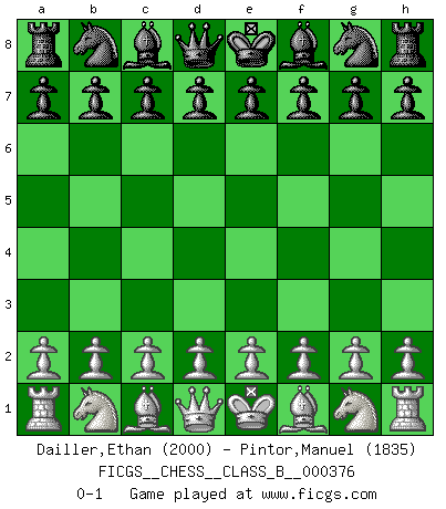 Last move : 0-1 2024 August 17 0:31:39 [Event "FICGS__CHESS__CLASS_B__000376"] [Site "FICGS"] [Date "2024.07.07"] [Round "1"] [White "Dailler,Ethan"] [Black "Pintor,Manuel"] [Result "0-1"] [WhiteElo "2000"] [BlackElo "1835"] 0-1 This chess game has been lost on time (started : 2024.07.07 13:44:22) Follow this game move after move (download)Chess is a terrible game. If you have no center, your opponent has a freer position. If you do have a center, then you really have something to worry about ! (Siegbert Tarrasch) Die meiste Zeit treffe ich auf Gegner, die meine Enkel sein könnten. Ich bin da, um ihnen zu zeigen, dass sie von mir noch einiges lernen können. (Viktor Kortschnoi) Vive, pierde y aprende al observar a tu oponente como ganar. (Amber Steenbock) Ce qui est bien, c'est d'avoir tout un tas de pièces en prise : l'adversaire ne peut en prendre qu'une à la fois. Cité par Thierry Audin. But they are useless. They can only give you answers. (Pablo Picasso, about computers)