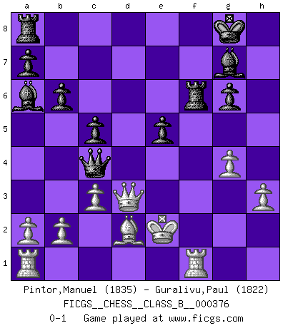 Last move : 0-1 2024 August 2 17:43:21 [Event "FICGS__CHESS__CLASS_B__000376"] [Site "FICGS"] [Date "2024.07.07"] [Round "1"] [White "Pintor,Manuel"] [Black "Guralivu,Paul"] [Result "0-1"] [WhiteElo "1835"] [BlackElo "1822"] 1.e4 c5 2.f4 d5 3.exd5 Qxd5 4.Nf3 Nc6 5.Nc3 Qd8 6.Bc4 Nh6 7.O-O g6 8.d3 Bg7 9.h3 Nf5 10.Ne4 O-O 11.c3 b6 12.Nfg5 Na5 13.Qf3 Nxc4 14.dxc4 h6 15.g4 Nh4 16.Qf2 hxg5 17.fxg5 Qd3 18.Qxh4 Qxe4 19.Bf4 Bb7 20.Qg3 e5 21.Bd2 f5 22.gxf6 Qh1+ 23.Kf2 Rxf6+ 24.Ke2 Qe4+ 25.Qe3 Qxc4+ 26.Qd3 Ba6 0-1 Follow this game move after move (download)The Pin is mightier than the sword. (Fred Reinfeld) Das Schach hält seine Meister in eigenen Banden, Fesseln; auf vielerlei Weise formt es ihren Geist, so dass die innere Freiheit selbst des Stärksten beeinflusst wird. (Albert Einstein) Si pudieramos observar el interior de la cabeza de un jugador de Ajedrez, encontraríamos ahí un mundo lleno de sentimientos, imágenes, ideas, emoción y pasión. (Alfred Binet) Les échecs sont un jeu par leur forme, un art par leur essence et une science par sa difficulté d'acquisition. Ils peuvent vous procurer autant de plaisir qu'un bon livre ou une belle musique, mais vous n'aurez une réelle joie que si vous arrivez à bien jouer. (Tigran Petrosian) Wisdom is the reward you get for a lifetime of listening when you'd have preferred to talk. (Doug Larson)