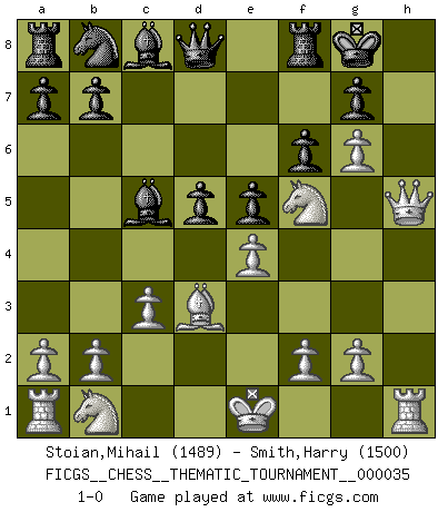 Last move : 1-0 2007 October 27 3:44:31 [Event "FICGS__CHESS__THEMATIC_TOURNAMENT__000035"] [Site "FICGS"] [Date "2007.09.20"] [Round "1"] [White "Stoian,Mihail"] [Black "Smith,Harry"] [Result "1-0"] [WhiteElo "1489"] [BlackElo "1500"] 1.e4 c5 2.Nf3 e6 3.d4 cxd4 4.Nxd4 Bc5 5.c3 Nf6 6.Bg5 O-O 7.Bd3 h6 8.h4 e5 9.Nf5 hxg5 10.hxg5 Ng4 11.Qxg4 d5 12.Qh5 f6 13.g6 1-0 Sicilian defense Kingside Castling by player Black (move 6) Player White won this chess game. Follow this game move after move (download)The winner of the game is the player who makes the next-to-last mistake. (Savielly Tartakover) Der Bart als Geschlechtszeichen mitten im Gesicht ist obszön. Daher gefällt er den Weibern. [Zugegeben, kein Schachzitat, aber unglaublich originell] (Arthur Schopenhauer) El Ajedrez es una hermosa aventura. (Bent Larsen) Les Cavaliers se révèlent fort utiles dans les positions fermées. D'habitude, les Fous sont un peu plus forts que les Cavaliers dans les positions ouvertes. Qu'on le veuille ou non, il restera toujours des exceptions ! I feel so... helpless. (C-3PO in Star Wars ep.3)