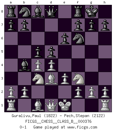 Last move : 0-1 2024 September 14 23:46:8 [Event "FICGS__CHESS__CLASS_B__000376"] [Site "FICGS"] [Date "2024.07.07"] [Round "1"] [White "Guralivu,Paul"] [Black "Pech,Stepan"] [Result "0-1"] [WhiteElo "1822"] [BlackElo "2122"] 1.d4 Nf6 2.c4 e6 3.Nc3 Bb4 4.e3 O-O 5.Bd3 d5 6.Nf3 c5 0-1 This chess game has been lost on time (started : 2024.07.07 13:44:22) Follow this game move after move (download)Fischer wanted to give the Russians a taste of their own medicine. (Larry Evans) In der Schule lernt man nichts. Es ist nur Zeitverschwendung. (Robert James Fischer) Un mal plan es mejor que no tener ningún plan. (Frank Marshall) L'attaque fait le spectacle, la défense gagne les matchs. (Dicton footballistique) Gambling is the son of avarice and the father of despair. (French proverb)