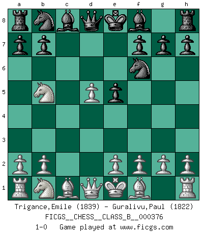 Last move : 1-0 2024 September 18 16:12:46 [Event "FICGS__CHESS__CLASS_B__000376"] [Site "FICGS"] [Date "2024.07.07"] [Round "1"] [White "Trigance,Emile"] [Black "Guralivu,Paul"] [Result "1-0"] [WhiteElo "1839"] [BlackElo "1822"] 1.Nf3 Nf6 2.c4 c5 3.d4 cxd4 4.Nxd4 e5 5.Nb5 d5 6.cxd5 1-0 This chess game has been lost on time (started : 2024.07.07 13:44:22) Follow this game move after move (download)Modern Chess is too much concerned with things like Pawn structure. Forget it, Checkmate ends the game. (Nigel Short) Immer nach dem besten Zug zu suchen ist ziemlich unpraktisch. (Nigel Short) El Ajedrez es parte de una cultura y si una cultura esta en decadencia, entonces también el Ajedrez declinará. (Mikhail Botvinnik) La tactique est l'élément le plus important du milieu de jeu. (Siegbert Tarrasch) Players are not good because they find tactics, it is about the way to find the positions in which those tactics are hidden. (Luc-Olivier Leclerc)