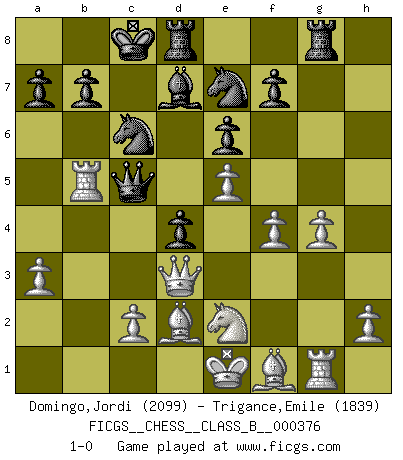 Last move : 1-0 2024 September 17 5:58:48 [Event "FICGS__CHESS__CLASS_B__000376"] [Site "FICGS"] [Date "2024.07.07"] [Round "1"] [White "Domingo,Jordi"] [Black "Trigance,Emile"] [Result "1-0"] [WhiteElo "2099"] [BlackElo "1839"] 1.e4 e6 2.d4 d5 3.Nc3 Bb4 4.e5 c5 5.a3 Bxc3+ 6.bxc3 Ne7 7.Qg4 Qc7 8.Qxg7 Rg8 9.Qxh7 cxd4 10.Ne2 Nbc6 11.f4 Bd7 12.Qd3 dxc3 13.Qxc3 Nf5 14.Rb1 d4 15.Qd3 O-O-O 16.Rg1 Qa5+ 17.Bd2 Qc5 18.g4 Nfe7 19.Rb5 1-0 Follow this game move after move (download)There is only one thing Fischer does in Chess without pleasure: to lose ! (Boris Spassky) Fallen sollten polizeilich verboten werden. (Savielly Grigorievitsch Tartakower) El Ajedrez es un juego de pelea el cual es puramente intelectual e incluye la suerte. (Richard Reti) Ne tendez aucun piège pour le plaisir ! Ne jouez rien dans l'espoir que l'adversaire réagisse de façon stupide ! Prenez toujours pour acquis que l'adversaire va trouver le meilleur coup ! Ne jouez jamais de coup dans l'espoir que l'adversaire ne voie pas la menace ! Chacun de vos coups doit améliorer la position d'une façon ou d'une autre. Sometimes it pays to stay in bed in Monday, rather than spending the rest of the week debugging Monday's code. (Dan Salomon)