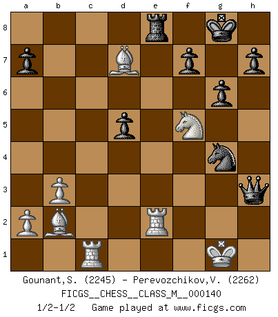 Last move : 1/2-1/2 2024 August 3 23:57:25 [Event "FICGS__CHESS__CLASS_M__000140"] [Site "FICGS"] [Date "2024.07.08"] [Round "1"] [White "Gounant,Stanislas"] [Black "Perevozchikov,Vjacheslav"] [Result "1/2-1/2"] [WhiteElo "2245"] [BlackElo "2262"] 1.b3 Nf6 2.Bb2 e6 3.Nf3 d5 4.c4 c5 5.cxd5 exd5 6.g3 Nc6 7.Bg2 Bd6 8.O-O O-O 9.d4 cxd4 10.Na3 Re8 11.Nb5 Bg4 12.Nbxd4 Ne4 13.Rc1 Qb6 14.h3 Bd7 15.e3 Qa6 16.Nxc6 bxc6 17.Rc2 Rac8 18.Qd4 Nf6 19.Rfc1 Bf5 20.Bf1 Qb7 21.Bd3 c5 22.Bxf5 cxd4 23.Bxc8 Qb8 24.Nxd4 Bxg3 25.fxg3 Qxg3+ 26.Kh1 Qxe3 27.Nf5 Qxh3+ 28.Kg1 Ng4 29.Bd7 g6 30.Re2 1/2-1/2 Follow this game move after move (download)Fischer is completely natural. He plays no roles. He's like a child. Very, very simple. (Zita Rajcsanyi) Computer sind die einzigen Gegner, die nicht immer eine Ausrede auf Lager haben, wenn sie gegen mich verlieren. (Robert James Fischer) El Ajedrez es imaginación. (David Bronstein) Les échecs, c'est l'art d'analyser. (Mikhail Botvinnik) As the days dwindle down... to a precious few. (Maxwell Anderson)