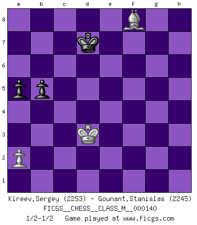 Last move : 1/2-1/2 2024 July 26 17:58:18 [Event "FICGS__CHESS__CLASS_M__000140"] [Site "FICGS"] [Date "2024.07.08"] [Round "1"] [White "Kireev,Sergey"] [Black "Gounant,Stanislas"] [Result "1/2-1/2"] [WhiteElo "2253"] [BlackElo "2245"] 1.e4 e6 2.d4 d5 3.e5 c5 4.c3 Nc6 5.Nf3 Bd7 6.Be2 f6 7.O-O fxe5 8.Nxe5 Nxe5 9.dxe5 Qc7 10.Re1 O-O-O 11.Nd2 Kb8 12.Nf3 Ne7 13.Ng5 Nf5 14.Bd3 g6 15.Rb1 h6 16.Nf7 Ba4 17.b3 Bxb3 18.Qxb3 Qxf7 19.c4 Nd4 20.Qc3 Qc7 21.cxd5 exd5 22.Bxg6 Rg8 23.Bh5 Qh7 24.Rb2 Qf5 25.Bd1 Ne6 26.Kh1 c4 27.f4 Rg7 28.h3 Nxf4 29.Qf3 Rf7 30.g4 Qd3 31.Rf2 Bc5 32.e6 Nxh3 33.exf7 Nxf2+ 34.Kg2 Nxd1 35.Qxd3 cxd3 36.Rxd1 Bf8 37.g5 hxg5 38.Bxg5 Rc8 39.Bf4+ Ka8 40.Rxd3 b5 41.Kf3 Rd8 42.Re3 Kb7 43.Re8 Rc8 44.Bg5 Bg7 45.Kf4 d4 46.Be7 d3 47.Rxc8 Kxc8 48.Ke3 a5 49.Kxd3 Kd7 50.f8Q Bxf8 51.Bxf8 1/2-1/2 Follow this game move after move (download)A good player is always lucky. (Jose Raul Capablanca) Ein Schachgenie ist jemand der verdammt gut Schach spielt. (Jonathan Levitt) En un gambito tu regalas un Peón por el bién de tomar un juego perdido. (Samuel Standige Boden) À la honte des hommes, on sait que les lois du jeu sont les seules qui soient partout justes, claires, inviolables et exécutées. Pourquoi l'Indien qui a donné les règles du jeu d'échecs est-il obéi de bon gré dans toute la terre, et que les décrétales des papes, par exemple, sont aujourd'hui un objet d'horreur et de mépris ? C'est que l'inventeur des échecs combina tout avec justesse pour la satisfaction des joueurs, et que les papes, dans leurs décrétales, n'eurent en vue que leur seul avantage. L'Indien voulut exercer également l'esprit des hommes et leur donner du plaisir; les papes ont voulu abrutir l'esprit des hommes. Voltaire (Dictionnaire philosophique / Garnier 1967) The age of a woman doesn't mean a thing. The best tunes are played on the oldest fiddles. (Ralph Waldo Emerson)