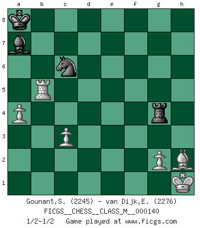 Last move : 1/2-1/2 2024 November 22 11:9:56 [Event "FICGS__CHESS__CLASS_M__000140"] [Site "FICGS"] [Date "2024.07.08"] [Round "1"] [White "Gounant,Stanislas"] [Black "van Dijk,Erik L."] [Result "1/2-1/2"] [WhiteElo "2245"] [BlackElo "2276"] 1.b3 e5 2.Bb2 Nc6 3.e3 d5 4.Bb5 Bd6 5.f4 f6 6.Qh5+ g6 7.Qh4 exf4 8.Nf3 fxe3 9.O-O Bd7 10.Nc3 Nce7 11.dxe3 c6 12.Bd3 Qc7 13.e4 O-O-O 14.exd5 cxd5 15.Kh1 h5 16.a4 a6 17.b4 Nh6 18.b5 g5 19.Qd4 Bc5 20.Qxf6 Ng4 21.Qxg5 Rhf8 22.h3 Rxf3 23.hxg4 Rg8 24.Qxh5 Bxg4 25.Nxd5 Rxf1+ 26.Rxf1 Bxh5 27.Nxc7 Kxc7 28.Be5+ Kb6 29.bxa6 bxa6 30.Rb1+ Kc6 31.Bxa6 Kd5 32.Bh2 Bg6 33.Rd1+ Kc6 34.Bb5+ Kb6 35.Rb1 Ka7 36.Bd3 Be8 37.Bb8+ Ka8 38.Be4+ Bc6 39.Bxc6+ Nxc6 40.Bh2 Rg4 41.Rb5 Ba7 42.c3 1/2-1/2 Follow this game move after move (download)There are two classes of men; those who are content to yield to circumstances and who play whist; those who aim to control circumstances, and who play Chess. (Mortimer Collins) Strategie ist, wie man ein Mädchen auf den Rücksitz bekommt. Taktik ist, was man tut, wenn man dann dort ist. (Anonymous) Un buen jugador siempre tiene buena suerte. (José Raúl Capablanca) Les sacrifices démontrent seulement que quelqu'un a gaffé. (Savielly Tartacover) Life is pleasant. Death is peaceful. It's the transition that's troublesome. (Isaac Asimov)