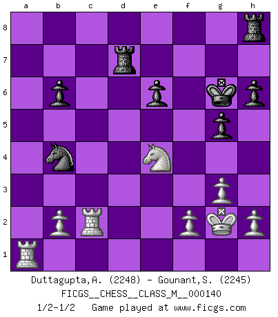 Last move : 1/2-1/2 2024 October 25 10:27:11 [Event "FICGS__CHESS__CLASS_M__000140"] [Site "FICGS"] [Date "2024.07.08"] [Round "1"] [White "Duttagupta,Aniruddha"] [Black "Gounant,Stanislas"] [Result "1/2-1/2"] [WhiteElo "2248"] [BlackElo "2245"] 1.Nf3 e6 2.c4 b6 3.g3 Nf6 4.Bg2 Bb7 5.O-O c5 6.Nc3 Be7 7.Re1 d5 8.cxd5 Nxd5 9.e4 Nb4 10.d4 cxd4 11.Nxd4 N8c6 12.Nxc6 Qxd1 13.Rxd1 Bxc6 14.Bf4 g5 15.Bd6 Rd8 16.e5 Bxd6 17.exd6 Bxg2 18.Kxg2 f5 19.Nb5 Kd7 20.Nd4 Kxd6 21.Nxf5+ Ke5 22.Nd6 Kf6 23.Rac1 h6 24.Rd2 Nxa2 25.Ra1 Nb4 26.Rxa7 Nd5 27.Ne4+ Kg6 28.Ra1 Rd7 29.Rc2 Nb4 1/2-1/2 Follow this game move after move (download)Fischer was a master of clarity and a king of artful positioning. His opponents would see where he was going but were powerless to stop him. (Bruce Pandolfini) Frage des Reporters: -Worin besteht das Ziel von Gambiteröffnungen? Antwort: -Auf Kosten der Partie einen Ruf als Angriffspieler zu erwerben.- (Siegbert Tarrasch) Tu eres para mi la Reina en d8 y yo soy el Peón en d7!!. (GM Eduard Gufeld) Vous savez, camarade Pachman, je n'éprouve pas de plaisir à être ministre, je jouerais plutôt aux échecs comme vous, ou alors ferais une révolution au Venezuela. (Che Guevara à Ludek Pachman, 'Checkmate in Prague', 1975) Information on the Internet is subject to the same rules and regulations as conversation at a bar. (George Lundberg)