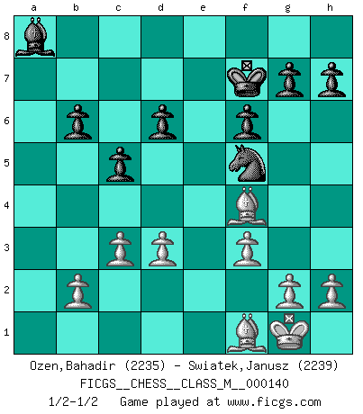 Last move : 1/2-1/2 2024 September 10 10:34:45 [Event "FICGS__CHESS__CLASS_M__000140"] [Site "FICGS"] [Date "2024.07.08"] [Round "1"] [White "Ozen,Bahadir"] [Black "Swiatek,Janusz"] [Result "1/2-1/2"] [WhiteElo "2235"] [BlackElo "2239"] 1.e4 e5 2.Nf3 Nc6 3.Bb5 Nf6 4.O-O Nxe4 5.Re1 Nd6 6.Nxe5 Be7 7.Bf1 Nxe5 8.Rxe5 O-O 9.Nc3 Bf6 10.Re1 Re8 11.Nd5 Rxe1 12.Qxe1 b6 13.Nxf6+ Qxf6 14.d3 Bb7 15.Qb4 c5 16.Qf4 Qxf4 17.Bxf4 Nf5 18.a4 f6 19.a5 Kf7 20.axb6 axb6 21.Rxa8 Bxa8 22.c3 d6 23.f3 1/2-1/2 Follow this game move after move (download)All that matters on the Chessboard is good moves. (Bobby Fischer) Wer wird heute Abend ihr Gegner sein? -- Heute Abend spiele ich gegen die schwarzen Steine. (Akiba Rubinstein) Sin errores no puede haber brillantez. (Emanuel Lasker) Mais l'homme est une créature légère et illogique : semblable au joueur d'échecs, il n'aime que le processus du but à atteindre, non le but lui-même. (Dostoïevsky) No man has ever achieved immortality in his own life time. (Unknown)