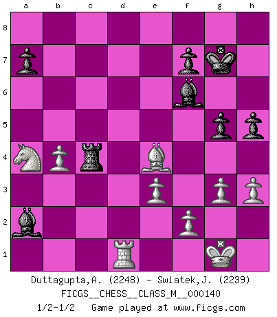 Last move : 1/2-1/2 2024 November 7 20:42:24 [Event "FICGS__CHESS__CLASS_M__000140"] [Site "FICGS"] [Date "2024.07.08"] [Round "1"] [White "Duttagupta,Aniruddha"] [Black "Swiatek,Janusz"] [Result "1/2-1/2"] [WhiteElo "2248"] [BlackElo "2239"] 1.Nf3 d5 2.g3 g6 3.Bg2 Bg7 4.d4 Nf6 5.c4 c6 6.O-O O-O 7.cxd5 cxd5 8.Nc3 Nc6 9.Ne5 Bf5 10.Nxc6 bxc6 11.Bf4 Nd7 12.Rc1 e5 13.dxe5 Nxe5 14.b3 h5 15.Qd2 Re8 16.h3 Qd7 17.Kh2 Qe7 18.Rfd1 Rad8 19.Na4 Bf6 20.Kg1 g5 21.Bxe5 Qxe5 22.Rxc6 Rc8 23.Rxc8 Rxc8 24.e3 Kg7 25.b4 Rc2 26.Qxd5 Qxd5 27.Rxd5 Be6 28.Rd1 Bxa2 29.Be4 Rc4 1/2-1/2 Follow this game move after move (download)That's what Chess is all about. One day you give your opponent a lesson, the next day he gives you one. (Bobby Fischer) Schach ist ein schwarz-weisser Dschungel. (Garry Kasparov) Desconfianza es la característica mas necesaria de un jugador de Ajedrez. (Siegbert Tarrasch) Les ravages du H expliquent la différence de niveau entre Tal et Thal [Abergel]. Don't be discouraged. It's often the last key in the bunch that opens the lock. (Author unknown)