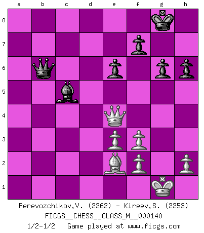 Last move : 1/2-1/2 2024 July 14 13:50:37 [Event "FICGS__CHESS__CLASS_M__000140"] [Site "FICGS"] [Date "2024.07.08"] [Round "1"] [White "Perevozchikov,Vjacheslav"] [Black "Kireev,Sergey"] [Result "1/2-1/2"] [WhiteElo "2262"] [BlackElo "2253"] 1.Nf3 Nf6 2.c4 e6 3.Nc3 d5 4.d4 Bb4 5.Qb3 c5 6.Bg5 dxc4 7.Qxc4 Nbd7 8.dxc5 Bxc5 9.e3 a6 10.Bd3 b5 11.Qh4 Bb7 12.O-O h6 13.Rfd1 Qb6 14.Bxf6 Nxf6 15.a4 O-O 16.axb5 axb5 17.Bxb5 Rxa1 18.Rxa1 Rd8 19.Rb1 Bxf3 20.gxf3 Rd2 21.Be2 Rxb2 22.Rxb2 Qxb2 23.Qc4 Qb6 24.Ne4 Nxe4 25.Qxe4 g6 1/2-1/2 Follow this game move after move (download)If your opponent cannot do anything active, then don't rush the position; instead you should let him sit there, suffer, and beg you for a draw. (Jeremy Silman) Ich war zu klein für die Schach-Schülermannschaft! (Woody Allen) No soy una persona materialista y por eso, no resiento la falta o pérdida del dinero. La ausencia de cosas mundanas carece de importancia. Ya que el Ajedrez es una forma en la que puedo ser tan materialista como yo desee sin tener la necesidad de vender mi alma. (Jamie Walter Adams) La guerre est enfant de la passion, la passion est enfant du narcissisme et le narcissisme est l'enfant. (...) Une autre partie ? (Thibault de Vassal) Industry executives and analysts often mistakenly talk about strategy as if it were some kind of chess match. But in chess, you have just two opponents, each with identical resources, and with luck playing a minimal role. The real world is much more like a poker game, with multiple players trying to make the best of whatever hand fortune has dealt them. In our industry, Bill Gates owns the table until someone proves otherwise. (David Moschella, 'Computerworld')