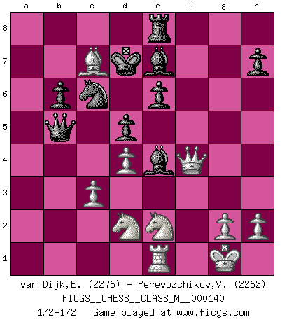 Last move : 1/2-1/2 2024 September 30 1:1:58 [Event "FICGS__CHESS__CLASS_M__000140"] [Site "FICGS"] [Date "2024.07.08"] [Round "1"] [White "van Dijk,Erik L."] [Black "Perevozchikov,Vjacheslav"] [Result "1/2-1/2"] [WhiteElo "2276"] [BlackElo "2262"] 1.e4 Nc6 2.d4 d5 3.e5 Bf5 4.c3 e6 5.Nd2 f6 6.f4 g5 7.Qh5+ Bg6 8.Qh3 Qd7 9.Bb5 gxf4 10.Ndf3 O-O-O 11.Bxf4 a6 12.Bxc6 Qxc6 13.Ne2 Qb5 14.b4 Re8 15.a4 Qd3 16.b5 Bg7 17.Qg3 Ne7 18.exf6 Bxf6 19.Qf2 axb5 20.axb5 Qxb5 21.O-O Nc6 22.Rfe1 b6 23.Qg3 Be4 24.Bxc7 Rhg8 25.Qf4 Be7 26.Ra8+ Kd7 27.Rxe8 Rxe8 28.Nd2 Bg6 29.Nf3 Be4 30.Nd2 1/2-1/2 Follow this game move after move (download)Bobby is the most misunderstood, misquoted celebrity walking the face of this earth. (Yasser Seirawan) Ich weiss nicht was Gott gegen mich auf 1.e4 antworten würde. (Robert James Fischer) Uno por uno, yo los acribillé, mi superioridad muy pronto se volvio aparente. (Jose Capablanca) Avant la finale, les dieux ont créé le milieu de partie. (Tarrasch) Real knowledge is to know the extent of one's ignorance. (Confucius)