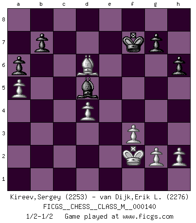 Last move : 1/2-1/2 2024 October 29 2:54:45 [Event "FICGS__CHESS__CLASS_M__000140"] [Site "FICGS"] [Date "2024.07.08"] [Round "1"] [White "Kireev,Sergey"] [Black "van Dijk,Erik L."] [Result "1/2-1/2"] [WhiteElo "2253"] [BlackElo "2276"] 1.e4 e6 2.d4 d5 3.Nc3 dxe4 4.Nxe4 Bd7 5.Bd3 Bc6 6.Nf3 Nd7 7.O-O Ngf6 8.Nc3 Be7 9.Re1 a6 10.a4 h6 11.Bd2 O-O 12.Qe2 Bb4 13.Ne5 Nxe5 14.dxe5 Bxc3 15.bxc3 Nd7 16.Qg4 f5 17.exf6 Qxf6 18.Qxe6+ Qxe6 19.Rxe6 Nc5 20.Re7 Nxd3 21.cxd3 Rad8 22.d4 Rd7 23.Rxd7 Bxd7 24.a5 Bb5 25.Rc1 Bc4 26.Rb1 Bb5 27.c4 Bxc4 28.Rc1 Be6 29.Rxc7 Rf7 30.Rc5 Rd7 31.Bc3 Rd6 32.f3 Rc6 33.Bb4 Rxc5 34.Bxc5 Kf7 35.Kf2 Bd5 36.Bd6 1/2-1/2 Follow this game move after move (download)Only the player with the initiative has the right to attack. (Wilhelm Steinitz) Mit sehr nachdenklichem Gesicht schreitet Bobby durch den Turniersaal. Was ist passiert?, fragt Lombardy. Ich stehe schlecht, antwortet Fischer. Lombardy: Dann biete doch einfach Remis an. Fischer: So schlecht stehe ich nun auch wieder nicht! (Robert James Fischer) No volvere nunca a jugar contigo. Has insultado a mi amigo. - cuando un oponente se maldijo por una mala jugada (Miguel Najdorf) Celui qui prend des risques peut perdre, celui qui n'en prend pas perd toujours. (Xavier Tartacover) If you are going through hell, keep going. (Winston Churchill)