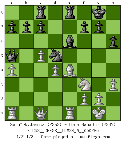 Last move : 1/2-1/2 2024 September 12 8:28:56 [Event "FICGS__CHESS__CLASS_A__000280"] [Site "FICGS"] [Date "2024.07.08"] [Round "1"] [White "Swiatek,Janusz"] [Black "Ozen,Bahadir"] [Result "1/2-1/2"] [WhiteElo "2252"] [BlackElo "2239"] 1.e4 e5 2.Nf3 Nf6 3.Nxe5 d6 4.Nf3 Nxe4 5.d4 d5 6.Bd3 Nc6 7.O-O Be7 8.c4 Nb4 9.Be2 O-O 10.Nc3 Bf5 11.a3 Nxc3 12.bxc3 Nc6 13.cxd5 Qxd5 14.Re1 Rfe8 15.Bf4 Rac8 16.h3 h6 17.Qc1 Bf8 18.a4 Bd6 19.c4 Qa5 20.c5 Bxf4 21.Qxf4 Be6 22.Bd3 Nb4 23.Be4 Nd5 24.Qc1 1/2-1/2 Follow this game move after move (download)By the beauty of his games, the clarity of his play, and the brilliance of his ideas, Fischer made himself an artist of the same stature as Brahms, Rembrandt, and Shakespeare. (David Levy) Wir können eben der zündenden Macht des Opfers nicht wiederstehen, denn die Begeisterung für das Opfer liegt in der Natur des Menschen. (Rudolf Spielmann) El Ajedrez es un juego terrible. Si no dominas el centro, tu oponente tiene una posición mas libre. Si tu tienes el centro, entonces realmente tienes algo de que preocuparte. (Siegbert Tarrasch) Toute estimation doit être constamment réévaluée. (Jacob Estrin) Yoga is 99% practice and 1% knowledge. (Sri Krishna Pattabhi Jois)
